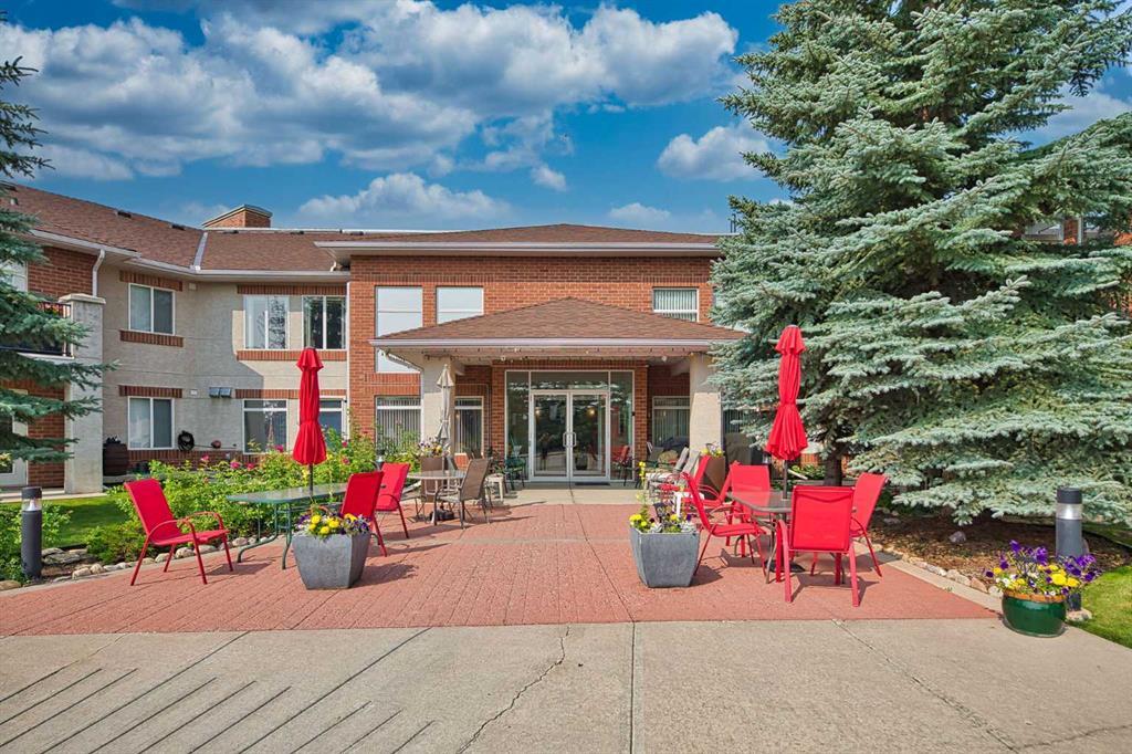 This is a rare opportunity - one of the best suites in a great 55+ building in SW Calgary. This 2 bedroom / 2 bath, ground level suite on the quiet side of the building has many upgrades. The granite kitchen countertop, double Bristol undermount sink, tiled backsplash with brushed nickel taps and hardware are accentuated by the undermount lights along the clean white cabinets. Add to this the stainless appliances, a large storage closet / pantry and you have the start of something beautiful. You will be thrilled with the LG washer / dryer combo set that is included. The heart of the apartment is the living room / dining room combination with large windows and a exterior door that leads to a small patio and manicured lawn. The entire unit is completed with a hardwood style, laminate floors. No carpets here. Both bedrooms have double closets for lots of storage. The primary bedroom has a 4 piece ensuite with a granite vanity top. The large main bath has a spacious walk-in shower with frosted doors, more granite plus grab bars. This is a well managed building with every amenity you desire - a huge common area for special events, games room, craft room, library, exercise equipment, a hair salon and of course, titled underground parking. Condo fee includes nearly everything: heat, electricity, reserve fund & management. Just set up your own cable. Along with sprinklers and smoke / CO2 detectors, there is a personal security system installed for your health and safety. Call your favourite REALTOR and come see this suite today.