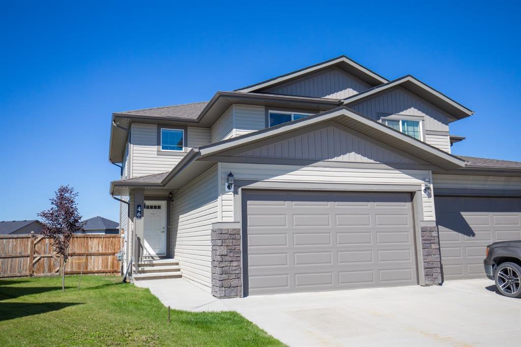 Located on a quiet close sits this excellent condition 2 storey executive duplex. This home stands out from the competition with its attached double garage and huge backyard. The home has stylish finishing choices throughout. It offers an open design with the kitchen looking onto the dining area and great room. The kitchen offers plenty of cabinets, counter space + a corner pantry. It leads out to the deck and large backyard. The yard has plenty of space for kids and pets and or to add a super sized second garage. Great floor plan with the attached garage leading to the foyer and half bath. The upper level is family friendly with 3 good sized bedrooms including the primary bedroom with an ensuite. Laundry is conveniently located on the bedroom level. The basement is open for your future development needs. It offers roughed in floor heating. Affordably priced this home is a unique opportunity!