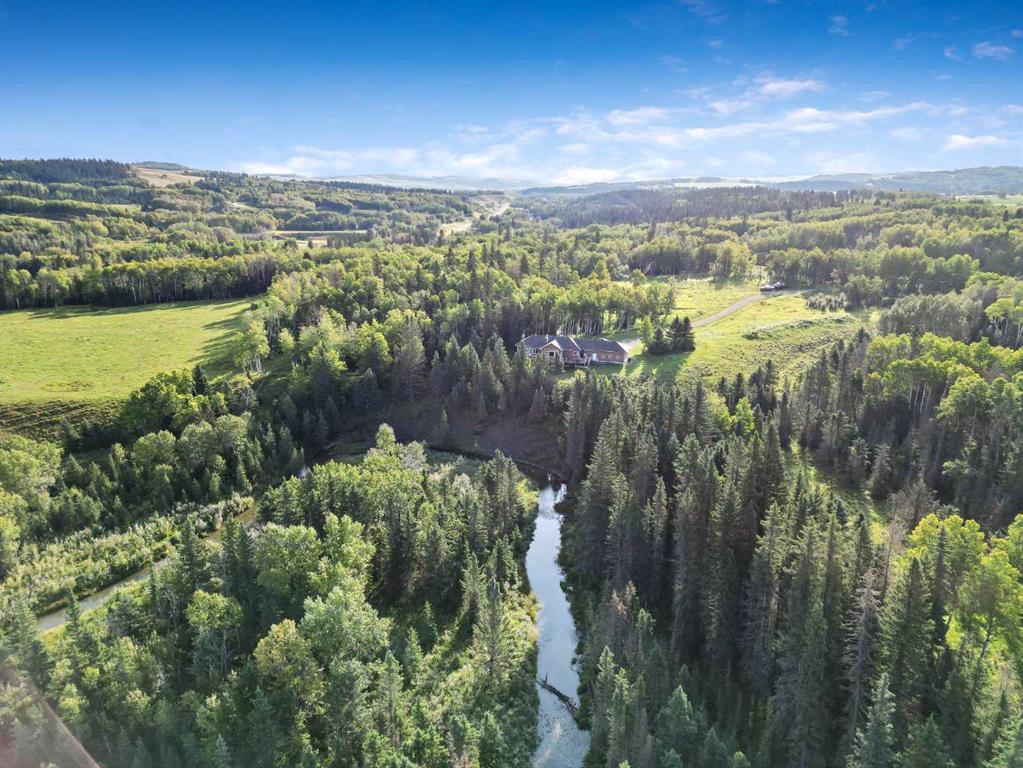 A Rare and Pristine 47 + Acres west of Millarville ! Tucked off of HWY 549 is this beautiful setting surrounded by nature, aroma of spruce trees, and the tranquil sound and scenery of Fisher Creek! The LASK constructed home situated against a grassy meadow lies over 3000 sq. ft. of living space in a well-kept walk out bungalow, with triple attached garage, front and back trex decking providing endless views to watch sun rises, sunsets and many oversize windows allows the panoramic views to be enjoyed from every angle in the home. Custom finishes throughout, from thick Whiskey Barrel oak flooring, timeless oak kitchen cabinets, large kitchen island, curved arches, tray ceiling in living room hugged with stone facing wood burning fireplace and flanked with built-ins. The primary suite offers a large walk-in closet with window, and an oversize 5- piece ensuite. Also on the main floor there is a large den that could be converted into 2nd bedroom if needed. The walkout basement is full of fun ! A bar, room for a pool table, woodstove and more of that amazing view and access to the lower deck, another bedroom, hobby room or a great gym. Two more storage rooms, one which has room you could potentially develop into another bedroom ! Also on the property is a small log cabin that would make a great project to make it into a fun play house or guest house. This property is very thoughtfully designed to be enjoyed and to appreciate the beauty of Alberta’s amazing landscape. Come and take a look, walk the scenery, or pull up a lawn chair and “just enjoy”.