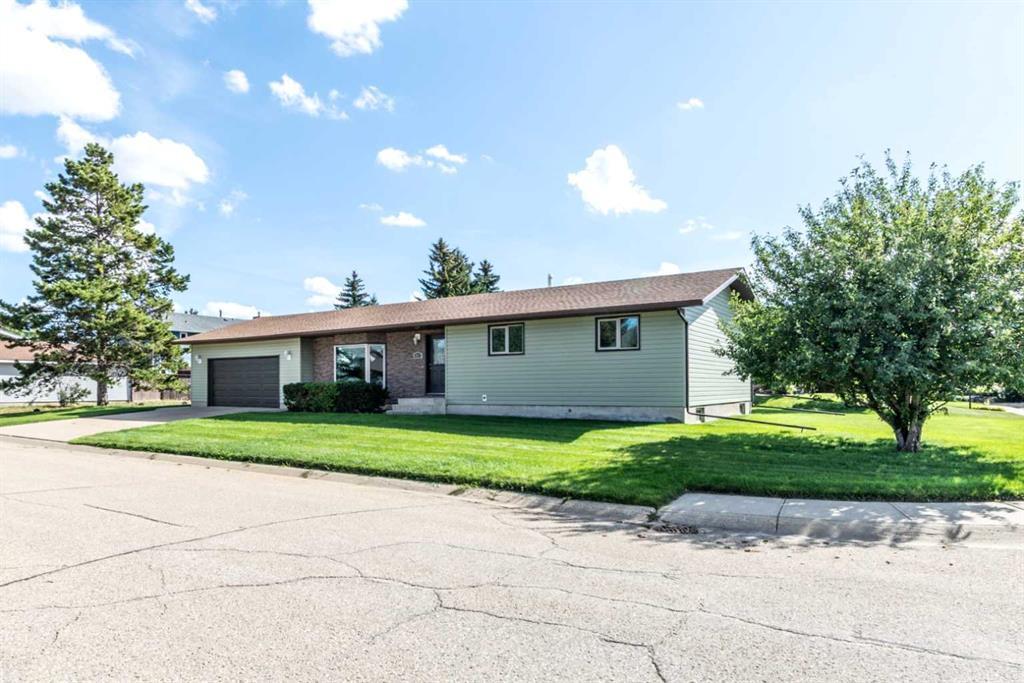 This spotless home is located on a corner lot in a nice, family-friendly neighborhood near the south edge of Stettler. Inside, this home has a spacious front entrance and down a couple steps there is a sunken living room with bay window facing the street. This is open to the dining room which has plenty of space for a large table to fit your whole family. The back door is here as well, which will take you out to the back yard. The kitchen has oak cabinets with a desk area and there are stainless steel appliances including a flat cooktop on the counter with hood above. Heading down the hall, there are a few handy closets for outdoor wear, towels and linens, etc. There are three bedrooms upstairs including the primary bedroom with a 2 pc ensuite. The main bathroom is a 4 pc and is a nice, bright space. Heading downstairs, the finished family room is huge, giving you the opportunity to utilize the space to suit your family. This is a bright, carpeted area with a wet bar in the corner (with linoleum and space for a mini fridge). Down the hall, there is an office, a den, and a storage room with solid shelving. The 3 pc bathroom is amazing with a walk in shower done in custom tile and an updated vanity. The laundry room doubles as a utility room and is as spotless as the rest of this home. Upgrades include vinyl windows, shingles, siding, and DuraDeck on the back deck. The exterior of this home is done in neutral tones with vinyl siding and a central, stacked stone accent wall. The front yard is a neat and tidy space with small flower bed, mature shade trees, and driveway to the two-car garage. This is a heated garage, with a work bench and numerous hooks to keep everything off the floor. The back yard is partially fenced and has a large deck for your barbeque and deck furniture. This home is ready for you and your family to move right in.