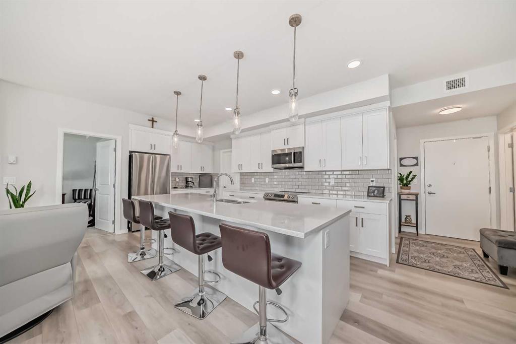 RARE 3 BEDROOM, 2 bath OPEN PLAN apartment with open eastern view of nose creek valley (no Buildings to obstruct light or view). Very spacious and open living space, builder size 1267 sqft. , 9 foot ceilings, LVP flooring, Low E Triple glazed windows, baseboard heating, A/C. Expansive kitchen over looking LR, DR and east wall of windows with view of Nose Creek Valley. A bright array of full height cabinetry (soft close drawers) in Kitchen, loads of cabinets and numerous 3 bank pot and pan drawers huge 10 X 3.5 foot quartz working island with sink, bar seating, dishwasher and garbage center, walk-in pantry, separate laundry room. Living room wall insert Electric FIREPLACE addition with remote control for cozy heat and multi-light color selection. Expansive balcony (21 ft X 7 ft) with A/C unit and BBQ gas outlet. Master Bedroom with w/in closet (upgraded wire shelving throughout) and 5 pce ensuite (dble sinks), 2 other bedrooms located on opposite side of Master BR along with 4 pce bath. One titled underground parking stall included . This property is meticulously kept. Conveniently located close to major arteries, 8 mins to airport, 15 - 20 minutes downtown, numerous shopping, entertainment and restaurant venues close by.