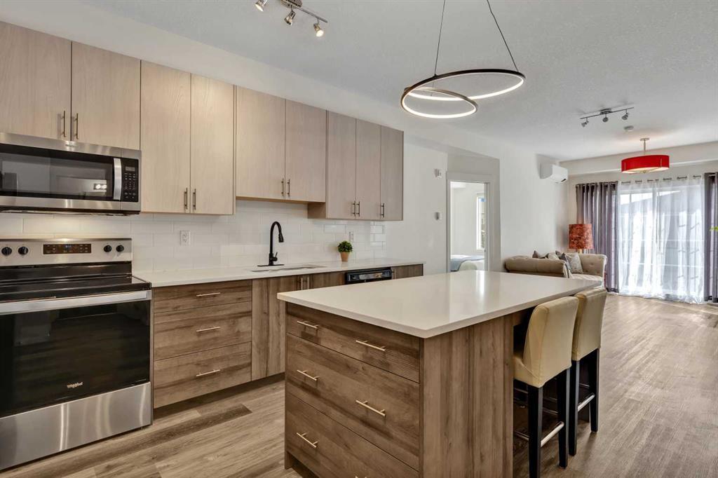 You’ll feel right at home in this spacious 840 sq.ft. 2 bed, 2 bath TOP FLOOR home with open plan, 9' ceilings, LVP flooring throughout the living areas and Built in AC for those hot summer days. Amazing TOP FLOOR WEST FACING UNIT with balcony. The kitchen is spectacular with full height cabinets, quartz counters, undermount sink and stainless steel appliances. The island is extensive with eating ledge which transitions into the spacious living area, perfect for entertaining. The spacious primary bedroom has a sizeable walk-in closet, quartz counters, and tub and shower combo. The additional bedroom is perfect for kids, guests, or an office. This top floor unit includes in-suite laundry, one titled heated underground parking and an assigned storage unit. Ideally situated near the park, pond, playground and within walking distance to nearby amenities. Enjoy living a low maintenance lifestyle with easy access to walking trails and biking paths in Sage Hill Meadows.