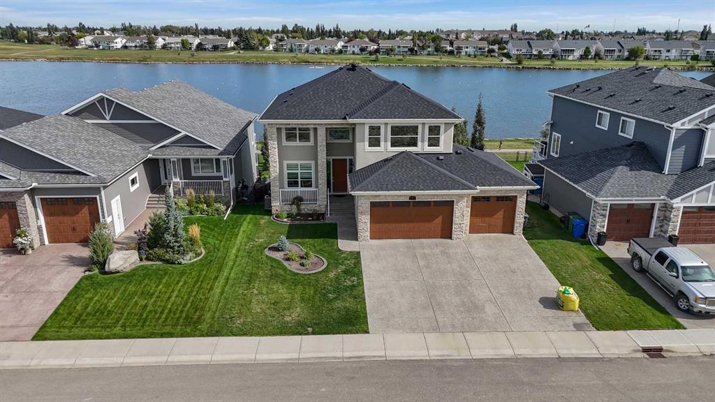 IMPECCABLY KEPT this FULLY FINISHED 5 BEDROOM/4 BATH home backs onto a serene lake in Strathmore Lakes. From the moment you enter this home you are captivated by the natural light and the amazing views that your eyes are drawn to. The foyer offers an oversized front closet which is offset by the MAIN FLOOR OFFICE/DEN directly to your left; a great work from home set up. Stunning views pull you through to the FAMILY SIZED GREAT ROOM that showcases built ins and a floor to ceiling stone faced gas fireplace. Centrally positioned, is the dining area that comfortably holds a table for eight settings. There is additional seating for four at the massive quartz covered island that features a beautiful waterfall edge. Full height espresso stained cabinetry, a bank of pot and pan drawers, built in recycle/garbage pullout and a stainless appliance package that incudes a gas cooktop, built in microwave, oven and dishwasher complete this chef inspired kitchen. Direct access from the dining area to the MAIN FLOOR DECK (over 25 ft long) expands your living space through the seasons for barbecue time and family gatherings. Completing the main floor are a WALK IN PANTRY, laundry room and a four piece bath. A glass paned staircase leads upstairs and opens to a FABULOUS GIGANTIC BONUS ROOM that features built-ins for the TV area, a dry bar and room for your oversized sectional plus exercise equipment too. The PRMARY BEDROOM is positioned at the rear overlooking the lake and has it's very own BALCONY, WALK IN CLOSET and 5 PC SPA LIKE ENSUITE BATH. A private water closet, dual sinks, deep soaker jetted tub and a fully tiled walk in shower complete the ensuite. Two other bedrooms both featuring walk in closets, a three piece bath (with another walk in shower) and storage are thoughtfully positioned in the upper level to maximize the windows and living space. The LOWER LEVEL WALK OUT with an illegal SUITE offers private access to the rear yard and delivers two more bedrooms another four piece bath and a space saving kitchen complete with fridge and stove. There is a private COVERED LOWER PATIO to enjoy your views of the lake and yard. Outside there are raised garden beds for the gardening enthusiast, a shed for your gardening needs and a dog run to keep your pet safe. and your grass green. The TRIPLE ATTACHED GARAGE and LED GEMSTONE LIGHTING that trims the soffits adds value and ambience. Amenities include schools of all levels, a hospital, churches, various options for shopping and a variety of eateries and coffee places. Strathmore Lakes Estates is a growing family friendly community. Lake lots are sold out! Priced at below replacement cost. Is this the time to consider a move for your family?