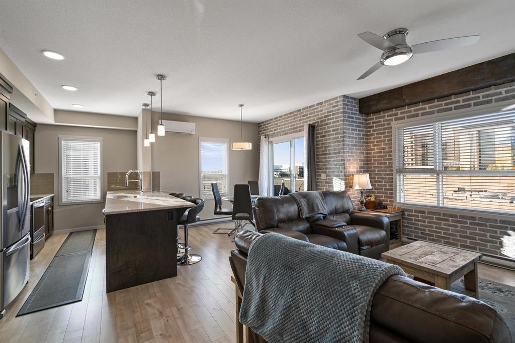 Here’s an amazing opportunity to own a top floor, corner unit apartment condo in the heart of Seton! Built by award winning builder, Cedarglen Living, this 915 square foot, 2-bedroom, 2 full bath unit is beautifully finished and has mountain and park views from the glorious wrap-around balcony and from the 6 outside windows. This unit has spacious living areas and two private-retreat bedrooms. Built in 2018, the unit was finished with upgraded appliances in the kitchen, upgraded stone counters, upgraded cabinetry, upgraded vinyl flooring, and upgraded stacked whirlpool washer/dryer combo. In 2020, the carpet was replaced with high grade underlay and upgraded carpet. In additional to these upgrades, the unit shows incredibly with the Manubric feature walls (which are paintable). The primary bedroom is complemented by a 3 pience en-suite bathroom as well as a generously-sized walk-in closet. The second bedroom makes a great office space or can fit a queen-sized bed set. Late-day sun ensures that the unit receives natural lighting, especially later on summer days. This home also has air conditioning for those summer days plus zoned heating for the winter! Completing the living space are 9-foot-high ceilings, a ceiling fan in the living room, and an amazing kitchen island and ample counter space all around in the kitchen! This unit has a dedicated dining room table space which is rare in this complex. Seton Park Place 1 is situated close to all amenities including the South Health Campus, the Seton YMCA, a 16-acre greenspace to the south of the complex, and the Seton Commercial District. There is one titled parking stall found in the secured, heated underground parkade along with a bike storage room and the complex is well maintained, well-run, and beautifully landscaped. Be sure to check this one out!