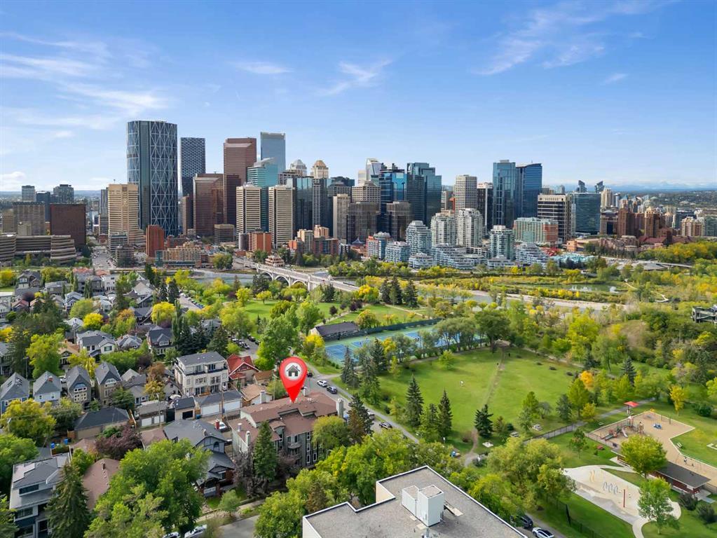 Welcome to this beautiful 2-bedroom, 2-bathroom corner unit condo located in the prestigious Park Avenue building in Crescent Heights, directly across from Rotary Park. With an unbeatable location, you're just a 10-minute walk from downtown, river pathways, Crescent Road/McHugh Bluffs, and within walking distance to Bridgeland, Kensington, Chinatown, SAIT, transit, shopping, and numerous excellent restaurants and cafes. The well-managed, pet-friendly building features a newer roof and windows, low condo fees, and across from Rotary Park, which offers tennis courts, lawn bowling, a dog park, picnic areas, a splash park, and spectacular views of downtown, the river, and the mountains. Inside, this spacious unit boasts newer laminate flooring, stainless steel appliances, maple cabinets, updated countertops, and south-facing windows throughout, filling the space with natural light. The large south facing patio provides stunning skyline and park views, while the living room features a cozy stone wood-burning fireplace. Additional highlights include a laundry room with hook-ups and ample storage space. The master retreat offers walk-through closets and a 2-piece ensuite bathroom, while the second bedroom is also generously sized and adjacent to a full bathroom. The condo comes with an assigned covered parking stall. Priced to sell, this is a must-see opportunity!