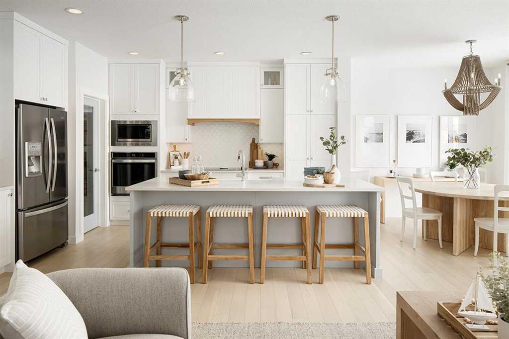 Midtown - 3 Midgrove Drive SW: This is a fantastic opportunity to own the current Shane Homes Showhome in Midtown. This Manhattan III showhome is brand new and never lived in with 2,299 sq ft, plenty of builder upgrades throughout, 4 bedrooms, 2.5 bathrooms and an attached double car garage. The open main floor greets you with a spacious open-to-above foyer, a bright white kitchen with a central island with seating for 4, ample cabinets for storage, stainless steel appliances including a built-in hood with custom cabinetry, walk-through pantry leads to the mud room; breakfast nook with west views; living room with custom mantle and surround feature on the electric fireplace; 2 pc powder room leads to the tiled mudroom with bench and lockers. The upper level features a primary bedroom with walk-in closet, spa-like 5 pc ensuite complete with soaker tub, glass shower with bench, dual sinks, and toilet with separate door; 3 additional bedrooms - 2 bedrooms with walk-in closets; central bonus room; 4 pc main bathroom; laundry room with folding shelf, hanging rod, shelf and additional linen storage. The lower level basement remains unspoiled. This corner lot has a west backyard backing onto a walking path and pond. This showhome located in Midtown of Airdrie is just steps away from the pond and pedestrian bridge, promenade with shops, and nearby schools. Airdrie is less than 20 minutes to the Calgary airport, less than 10 minutes to the QE II, and 15 minutes to north Calgary. Call for more info!