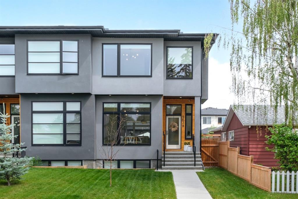 Welcome to this meticulously maintained semi-detached home in the desirable community of Bowness, offering a total of 2,884 square feet of beautifully designed living space. This property is a true gem, featuring top-tier upgrades, modern finishes, and a prime location close to schools, parks, and local amenities. The main floor boasts an airy, open-concept layout, with 10' ceilings and rich hardwood flooring throughout. The spacious living room is anchored by a stylish gas fireplace, perfect for cozy evenings. At the heart of the home is the gourmet central kitchen, which is equipped with a sleek gas cooktop, built-in oven and microwave, hood fan, and custom cabinetry, making it ideal for cooking enthusiasts and entertaining guests. Upstairs, you’ll find three generously sized bedrooms, each filled with natural light. The primary suite is a true retreat, complete with a spa-like 5-piece ensuite featuring dual vanities, a deep soaker tub, a separate glass-enclosed shower, as well a walk-in closet with custom built-ins. The upper floor also includes a thoughtfully designed laundry room and 9' ceilings for a bright and spacious feel. The fully finished basement provides additional large living space featuring a wet bar with beverage fridge. A large 4th bedrooms and full bathroom, as well as an abundance of storage complete this space. Outside, the backyard has been transformed into a low-maintenance oasis with artificial turf, ideal for year-round enjoyment without the upkeep. The double detached insulated garage offers plenty of space for vehicles and storage. This home is ideally situated just minutes from several top-rated schools, making it perfect for families. Bowness Park, one of Calgary’s most beloved green spaces, is within walking distance, offering year-round activities such as boating, skating, and picnic areas. Enjoy quick access to local shops, cafes, and major roads, while the nearby Bow River pathways provide endless opportunities for outdoor recreation.