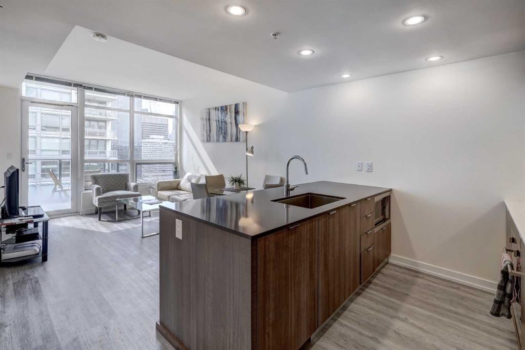 ALL Furniture can be included, long term lease can be in place (optional). Welcome to unit #1407 in the Outlook at Waterfront Towers, a stylish and contemporary one-bedroom condo located in Calgary’s vibrant Downtown. This thoughtfully designed unit offers modern living with high-end finishes, making it an ideal choice for urban professionals or investors. The open-concept layout features a sleek kitchen equipped with granite counter tops, stainless steel appliances, oversized island and built-in features, perfect for both dining and entertaining. The living area is bathed in natural light from floor-to-ceiling windows, with access to a private balcony that provides stunning views of the city skyline and Bow River. The primary bedroom includes a large closet and full-height windows, providing both comfort and style. The unit is completed by a modern 4-piece bathroom and in-suite laundry. Underground parking stall is included offering secure and hassle-free parking in the heart of downtown Calgary and additional storage space for convenience. Outlook at Waterfront Towers is a luxury high-rise offering a wide array of amenities for residents, including a state-of-the-art fitness center, yoga studio, steam rooms, private theatre room, and a resident lounge with a pool table and kitchen. The building also features 24-hour concierge service, secure underground parking, and beautifully landscaped outdoor spaces, including a community courtyard. Located in the heart of Chinatown, Waterfront Towers offers unparalleled access to downtown Calgary's finest amenities. This sought-after community provides proximity to a variety of dining options, cultural landmarks, and shopping centers. Residents enjoy easy access to the Bow River pathways and Prince’s Island Park, ideal for outdoor activities, festivals, and riverside walks. With nearby public transit, including LRT stations and bus routes, getting around the city is effortless. The downtown core, with its bustling business district and entertainment venues, is just minutes away. This exceptional unit at Waterfront Towers provides a perfect balance of luxury, convenience, and vibrant urban living in one of Calgary’s most desirable locations, book your private showing today!