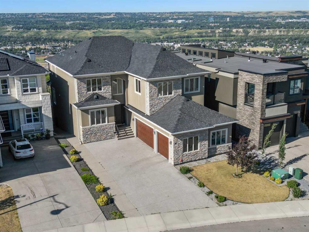 Stunning 5 bdrm + bonus room luxury home has 6,198 sf of modern living space on 3 levels with panoramic valley & downtown views! Featuring: stone & acrylic stucco exterior, decorative mullion windows, open plan with 10' main floor ceilings, solid core 8' doors, built-in wall units, engineered oak hardwood floors & Lutron dimmers. Enjoy the great room linear gas fireplace with impressive maple & stainless finish overlooking 150 acres of green space. Designer kitchen has rich dark stain full height shaker maple cabinets, hi-end stainless appliances, gas cooktop stove, canopy hood fan, large quartz counter island & easy access to dining room. Spacious master offers ideal retreat with luxurious spa like 5 piece ensuite: designer soaker tub & fully tiled shower. 1,761 sf walkout basement has extra bdrm, 4 piece bath, in-floor heat, wet bar, media & exercise room. Desirable SW location. WA unique panoramic view of the city and a stunning nighttime vista,walk to Calgary French & Int'l School. Quiet cul-de-sac road.