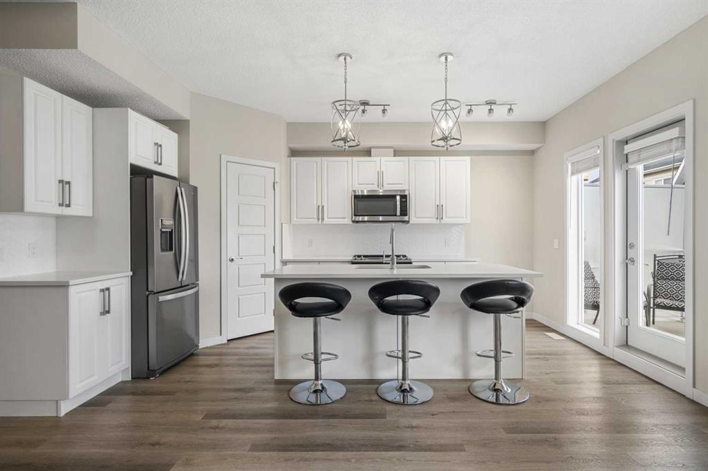 Welcome to this exquisite 2-bedroom, 2.5-bath END UNIT townhouse nestled in the vibrant and growing community of Redstone. Spanning 1,341sqft, this thoughtfully designed home offers a seamless blend of modern style and functional living. As you step inside, you're greeted by a bright, open-concept main floor filled with natural light, creating a warm and inviting atmosphere. The heart of the home is the beautifully appointed kitchen, featuring sleek stainless-steel appliances, an abundance of cabinetry, elegant quartz countertops, and a large central island perfect for both meal prep and casual dining. A convenient corner pantry ensures ample storage for all your kitchen essentials. Whether you're cooking up a storm or entertaining guests, this space is both stylish and practical. Step out onto the balcony, equipped with a gas line, making it ideal for summer BBQs and outdoor relaxation. The upper level boasts a convenient laundry area, offering both efficiency and practicality. The two spacious bedrooms are designed for comfort and privacy. The primary bedroom features a walk-through closet leading to a well-appointed 3-piece ensuite, providing a private retreat at the end of the day. The second bedroom is equally generous in size, with easy access to the additional full bathroom. This townhouse also offers the convenience of low condo fees, making homeownership more accessible while still enjoying all the benefits of a well-maintained property. Located in a family-friendly neighborhood, Redstone offers easy access to parks, top-rated schools, shopping centers, and recreation facilities. Commuting is a breeze with quick access to major routes like Stoney Trail and Metis Trail, connecting you to the rest of the city with ease. Don’t miss your chance to own this stylish and well-equipped home in one of Calgary’s most desirable areas. Schedule your viewing today and step into a lifestyle of comfort, convenience, and community!
