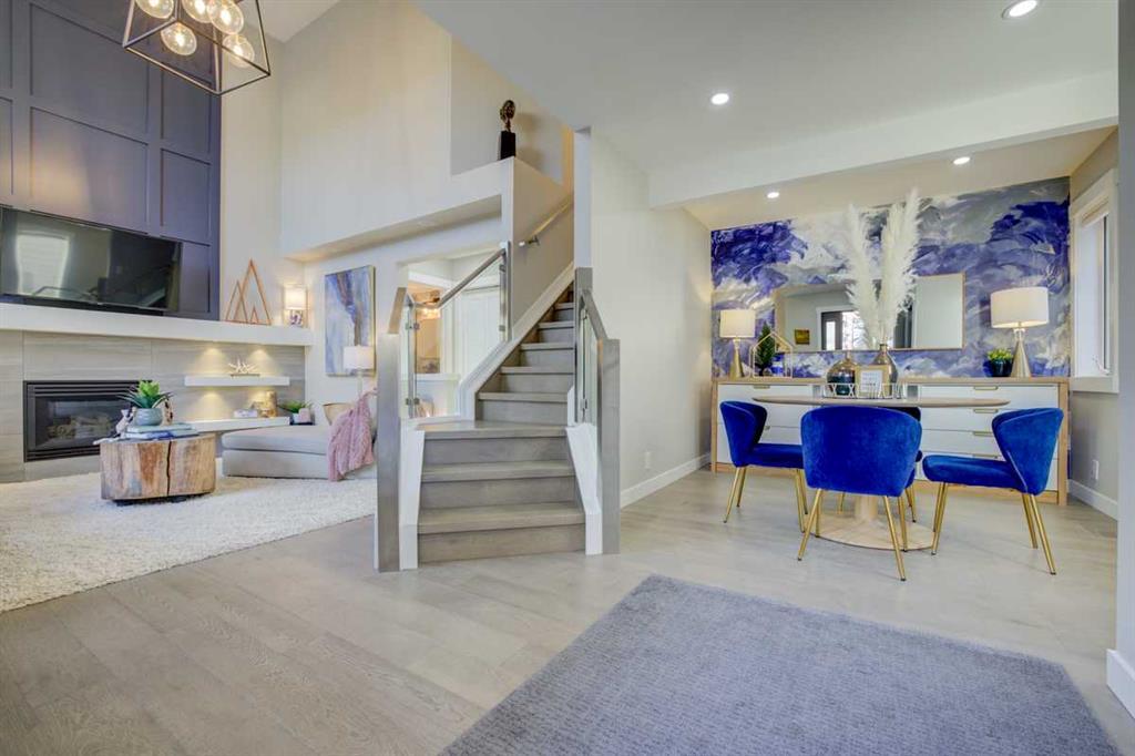 As you step inside, you’re greeted by a spacious, open-concept design. The heart of the home is the custom kitchen, which has been beautifully renovated with high-end stainless steel appliances and sleek stone countertops and custom kitchen cabinets. Thoughtfully designed cabinetry provides ample storage complete with wine fridge, making it both functional and stylish, perfect for casual meals or entertaining guests. The living room is a true showpiece, featuring a soaring two-story ceiling and a custom-built feature wall with built-in lighting and a fireplace that creates an inviting ambiance. Adjacent is the cozy office/flex space perfect for someone working from home or a great homework area for the kids.
