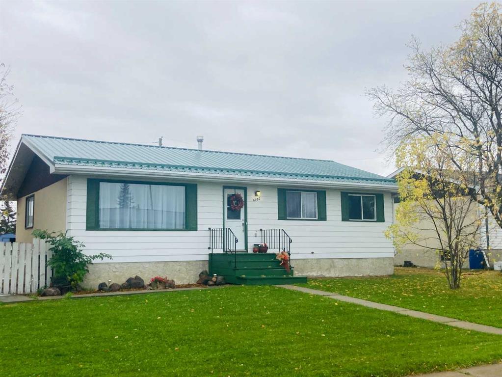 This beautiful Bungalow is located on a quiet Crescent close to the Hospital. Benifitting from brand new renovations on the main floor this home is move in ready and because it's empty, you can be in, not only before Christmas, but if you hurry ... even before snowfall! Brand new paint, new flooring and a metal roof are some of the upgrades. There is 1 child's bedroom upstairs opposite the 4pc main bathroom. But check out the unique Master bedroom thats the whole width of the house with its own unique office space and 2 pc ensuite. The basement has some developement and comes with washer/dryer, partial bathroom, bar and large office. The back yard is fenced and provides for an open 20' x 16' garage with attached 27' x 10' carport and lots of parking off the back alley. There is also a 10' x 8' garden shed. This is a great starter home for a young family.