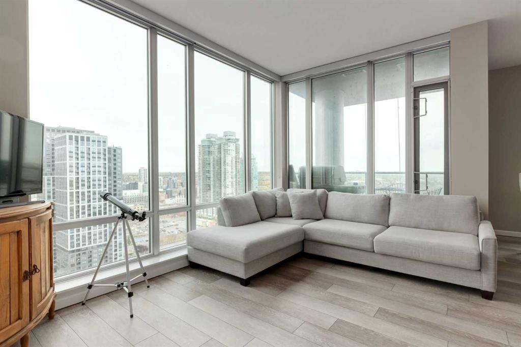 Experience elevated urban living in this stunning 26th-floor corner unit of the prestigious Vetro building - ideal for all those looking to embrace the vibrant downtown lifestyle. Conveniently located within walking distance of 17th Ave, the Mission district, and the Stampede grounds, this luxury condo offers unbeatable city access. The bright and airy interior boasts floor-to-ceiling windows that flood the space with natural light, offering sweeping views of the city to the north and Stampede Park to the east. The open-concept layout features a sleek, modern kitchen equipped with stainless steel appliances, granite countertops, and an island with a breakfast bar. You'll enjoy the privacy of two master bedrooms, each with walk-through closets and ensuite bathrooms, positioned on opposite sides of the unit – perfect for hosting guests or sharing with a roommate. Additional highlights include a spacious in-suite laundry room with extra storage, a balcony with a BBQ hookup, and a heated underground parking stall. The Vetro building offers impressive amenities, including visitor parking, a fully equipped fitness center, concierge services, 24/7 security, a recreation room with billiards, a theater room, an outdoor courtyard, and a relaxing jacuzzi/sauna. Incredible location & incredible value. Book your showing today!