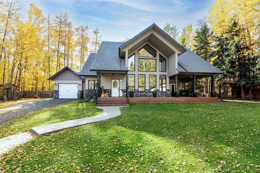 ~QUICK POSSESSION AVAILABLE!~ Enjoy this beautiful home with a PAVED WALKING TRAIL right out your back door! Surrounded all around by mature trees and quiet neighbors. A wood burning fireplace in the living room featuring a floor to ceiling stone and wood mantle cozies up the main floor, solid hardwood flooring, and maple cabinets add to the warm and inviting feeling of HOME! Kitchen features a corner pantry, gas stove (stainless appliances) and HUGE VAULTED CEILINGS. The master bedroom located on the MAIN FLOOR features a walk in closet that joins to a beautiful (cheater door) 4 piece bath, soaker corner jet tub and custom tiled shower. Also from the primary bedroom you have a private COVERED PATIO with drop down blinds for additional privacy. The main floor also boast a large mudroom, 2 piece powder room, and LAUNDRY! Attached single garage enters thru rear mudroom, and is just off the exit to your beautiful maintenance free patio. The basement is undeveloped but has 2 sumps and rough in for another bathroom. The back yard is fully fenced for your children and pets, and includes a gas hook up for your BBQ. There is a HEATED TRIPLE DETACHED GARAGE 32X24, with pavement right to your door step. At Parkland beach you can enjoy many activities, fishing, boating, a marina, boat slips for rent, play ground and a convenience store. Your children can attend the RIMBEY SCHOOL about 10 minutes away. Approximately 20 minutes to Sylvan Lake, and 45 minutes to Red Deer. This is a remarkable place to call home and very suitable for a couple or a growing family.