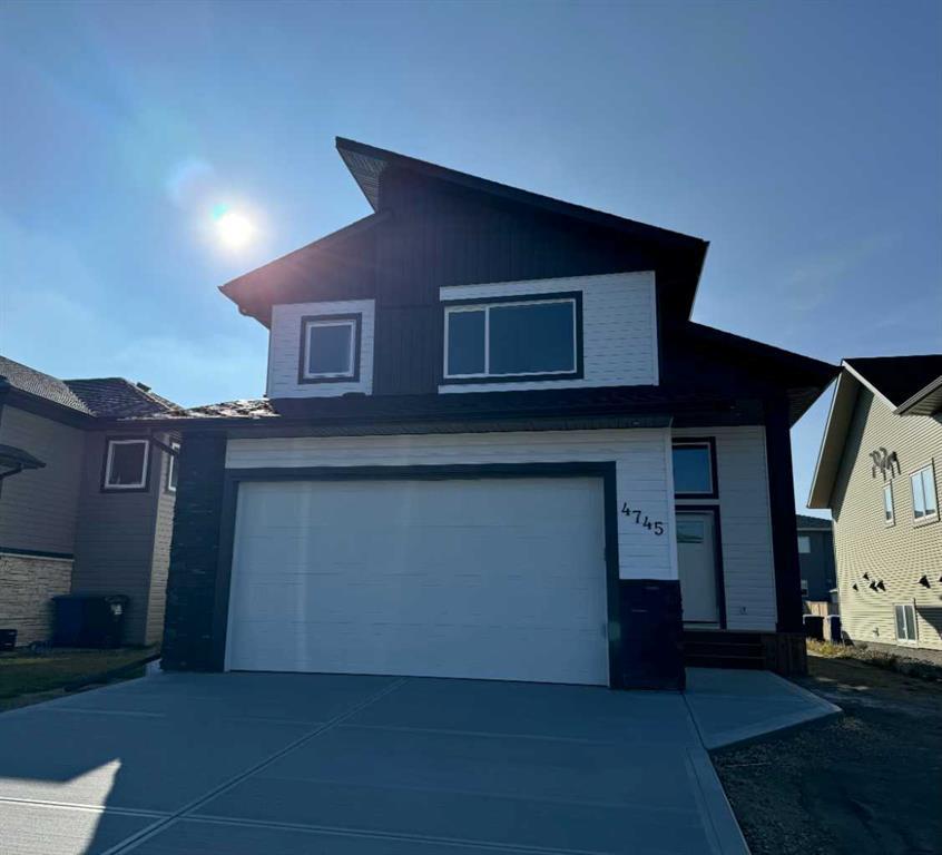 STUNNIING QUALITY BUILT MODIFIED BILEVEL NEW BUILD BY SAN MARIA HOMES IN ASPEN LAKES BLACKFALDS WITH A S.W. FACING REAR YARD! Beautiful tiled entry leading to the MAIN LEVEL OPEN PLAN SOUTH FACING LIVING/DINING/KITCHEN with luxury vinyl plank flooring, vaulted ceilings and an eye-catching electric fireplace with a floor-to-ceiling dark grey stone surround. Crisp white linen paint throughout. Impressive and functional dream kitchen with dark coffee bean maple cabinetry/quartz countertops/center island with extended breakfast bar/pantry and all stainless steel kitchen appliances included. The dining area, adjacent to the kitchen, is a good size with a garden door out to the SW facing deck. Two secondary bedrooms on the main level and a 4 pce main bath with quartz countertop. The Primary Bedroom is on the upper level with a magnificent walk-in-closet and 4 pce ensuite with quartz countertop and tile floor. Basement is open for development with 9 ft ceilings... TAXES NOT YET ASSESSED.....