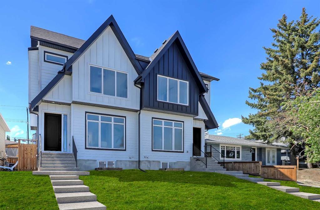 You’ll absolutely love your new SEMI-DETACHED INFILL across the street from Killarney School! Everything you need within a 3 km radius for the ultimate inner-city lifestyle – fields & playgrounds, an aquatic centre, fenced-in off-leash dog park, AE Cross School, Glamorgan Bakery, the Westbrook LRT, and even Westhills Shopping Centre, plus more! The highly desirable KILLARNEY location is only improved upon by this home’s fantastic layout, with room for all the kids across 4 bedrooms, an upper bonus room, and a built-in workstation on the main floor. The curb appeal, highlighted by the eye-catching two-tone exterior, welcomes you into the foyer with a built-in closet & bench, with direct access to the dedicated dining room. The dining room enjoys not only oversized East-facing windows for lots of natural light & a designer chandelier but also a stunning built-in feature wall with wood panelling and open wood-stained display shelving! The space seamlessly flows into the striking kitchen, complete with designer pendant lights above the long central island with waterfall edge &bot open display shelves, full-height cabinetry with display shelves & under cabinet lighting, shaker-style cabinetry, quartz countertops, a designer tile backsplash, and a good-sized walk-in pantry. The upgraded stainless steel appliance package includes a French door refrigerator, gas cooktop, wall oven & microwave, and dishwasher. Even the hood fan canopy follows the designer feel of the home with a custom two-tone wood canopy matching the rest of the kitchen! A built-in workstation is perfect for anyone working from home or watching kids while they do homework, and the rear living room is ideal for catching up with the family around the inset gas fireplace with wood-open display shelving, tile surround, and mantle. The rear mudroom is nicely tucked away with a tile floor, a built-in bench, built-in closet, and the powder room features a wood panel feature wall with a unique stone pedestal sink! Up the wood-wrapped staircase, a bonus room with wood display shelving gives your family more space to spread out. The upper floor hosts two secondary bedrooms with built-in closets, a modern 4-pc main bathroom, and a nice laundry room with tile floor and quartz countertop. The primary suite is sure to impress, with sky-high vaulted ceiling, wood panel feature, designer lighting, walk-in closet, and barn door entrance to the luxurious 5-pc ensuite w/ freestanding soaker tub and fully-tiled shower. The living space continues into the fully-developed basement, with a built-in media centre and impressive wet bar with subway tile backsplash, open display shelving, upper cabinets with uniquely designed glass doors, a quartz countertop, and a beverage fridge. There is another large bedroom and a 4-pc modern bathroom, completing the home nicely. This home and location are truly ideal for any family looking to settle into the ultimate inner-city lifestyle! *Photos from show suite next door, please view both*
