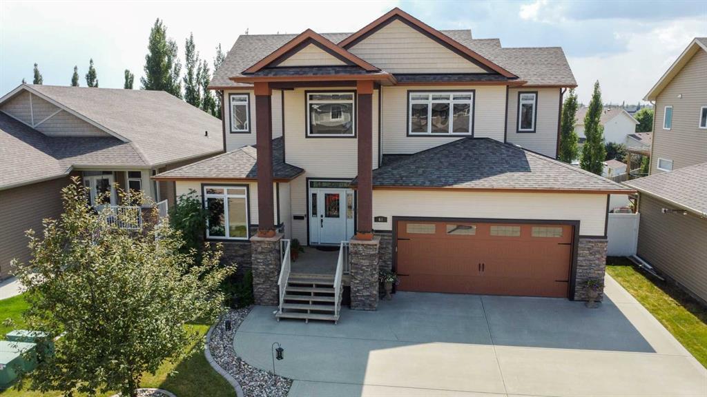 EXECUTIVE CUSTOM BUILT 4BDRM, 4BTH 2-STOREY WALKOUT ~ SUNNY SOUTH FACING BACKYARD ~ HEATED 3 SEASON SUNROOM ~ A spacious front veranda welcomes you to this well cared for home and leads to the foyer with 19ft coffered ceilings and tile floors ~ Just off the entry is a conveniently located home office with large windows overlooking the front yard ~ Open concept layout is complemented by high ceilings creating a feeling of spaciousness ~ The stunning kitchen offers an abundance of warm stained maple cabinets loaded with pots and pan drawers and finished with crown moulding, ample granite counter space including a raised eating bar with pendant lights above, travertine tile backsplash, garburator in sink and upper cabinet lighting ~ Easily host a large family gathering in the dining room that features garden door access to the sun room and upper deck with aluminum railing, waterproof decking and a gas line ~ The living room features large south facing windows, recessed lighting and is centred by a cozy gas fireplace with stacked stone, carved wood mantle and a TV niche above ~ Mud room with garage access has ample closet space ~ 2 piece main floor bathroom ~ Open staircase leads to the upper level and overlooks the foyer below ~ The private primary bedroom can easily accommodate a king size bed plus multiple pieces of large furniture, has a massive walk in closet with built in organizers, dressers and a bench plus a spa like ensuite featuring a huge walk in shower with dual shower heads, double vanity with added cabinets, oversized jetted tub and a water closet ~ 2 Additional bedrooms located on the upper level are both a generous size and share a 5 piece bathroom ~ Upper level laundry is located in it's own room, has built in cabinets and a sink ~ Lighted stairs with built in niches lead to the walkout basement with 9ft. ceilings and operational underfloor heat ~ The huge family room with large above grade windows has tons of room for entertaining plus garden door access to the lower covered deck (with wiring for a hot tub) that spans the entire width of the home ~ 4th bedroom is located next to the 4 piece basement bathroom ~ Additional features and updates include; central air conditioning, central vacuum, wired for sound inside and out, transom windows and storage niches throughout, extensive tile work throughout, exterior hot and cold taps ~ Triple attached garage is insulated, finished with drywall, has two overhead doors, man door to the backyard, floor drains and hot and cold taps ~ The sunny south facing backyard is fully fenced with vinyl fencing and back alley access, beautifully landscaped with mature trees, garden beds with concrete edging, raised garden beds, includes the shed and has in ground sprinklers (front and back) ~ Located close to multiple parks, schools, walking trails and shopping ~ Pride of ownership is evident!