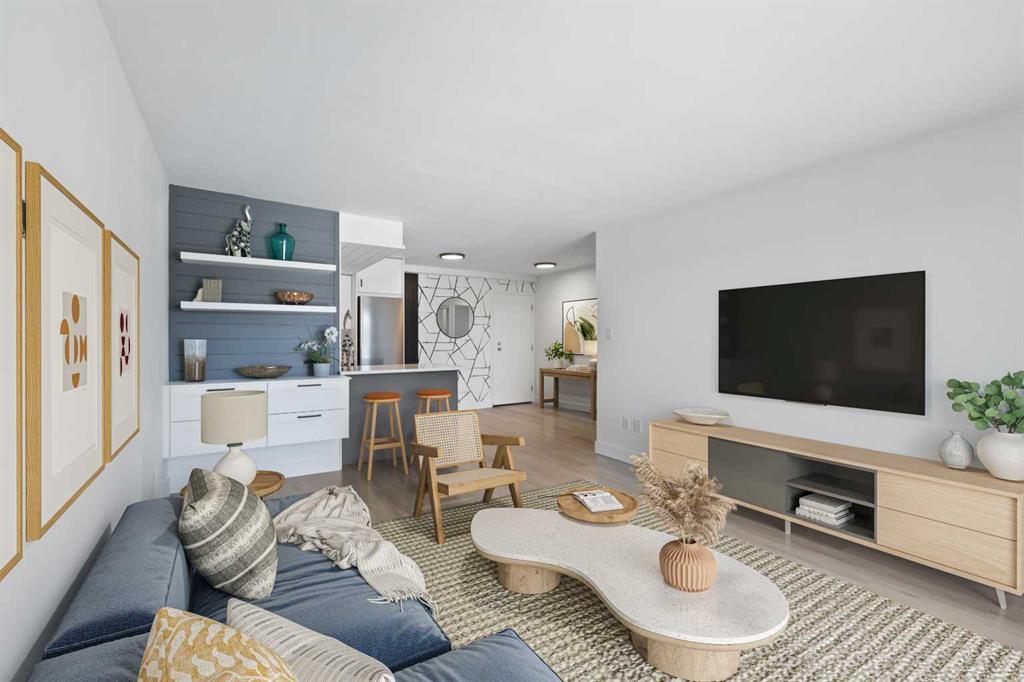 PROFESSIONAL RENOVATIONS JUST COMPLETED! QUALITY FINISHINGS AND DESIGNER STYLE await you! ELECTRICITY INCLUDED IN THE LOW CONDO FEES. Be the first to live here. Ready and waiting for a new owner!. This beautiful spacious 1 bedroom condo boasts 632 square feet and features a LARGE open living area, a large bedroom and a designer 4 piece bath. INSUITE LAUNDRY TOO with a new washer/dryer combo. Additional common laundry on site if needed. This home has 1 assigned parking spot in the underground heated and secure parkade. The large balcony is spacious for entertaining and relaxing. This home features a designer kitchen that will thrill the chef in the family. Upgraded NEW stainless steel appliances including a range with air fryer functionality and new 1 ¼” quartz countertops. All appliances come with warranties. Beautiful luxury vinyl plank waterproof flooring and gorgeous wallpapered feature walls with built-in floating shelves and floating cabinets take this home to another level. New designer LED lighting throughout. New black out cellular blinds included. PETS WELCOME! 1 dog or 1 cat (max weight 35 lbs). Well maintained building with a large common area foyer and 2 elevators. Leave your car at home! Walk everywhere! A must see property! Book your appointment today!!