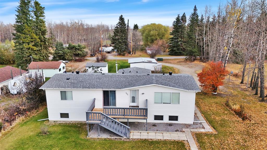 Enjoy small town living and affordable taxes in the quiet community of Alhambra. 1500 sq ft home welcomes you in with a big entrance and a short set of stairs up to the main floor offering a good working kitchen and adjoining dining area, huge living room plus a family room. 2 bedrooms including the primary with a 3 piece ensuite, 4 piece main bathroom and main floor laundry. Fully finished basement with in-floor heat, full kitchen, spacious rec room, 3 more bedrooms, another laundry and a 3 piece bathroom. Great suite potential. This large double lot offers plenty of parking with a front pad, rear double detached garage, 24x26' with 2 overhead doors and gravel floor and rear parking pad with plenty of room for your RV. Raspberry plants border the garden area with raised beds, 2 small green houses and a big storage shed. Enjoy the summer evenings out around the fire pit and your days soaking up the sun on the back deck. The home was set on a new basement in 1992 and shingles were replaced in 2020. Centrally located making it an easy commute west to Rocky or east to Sylvan and Red Deer.