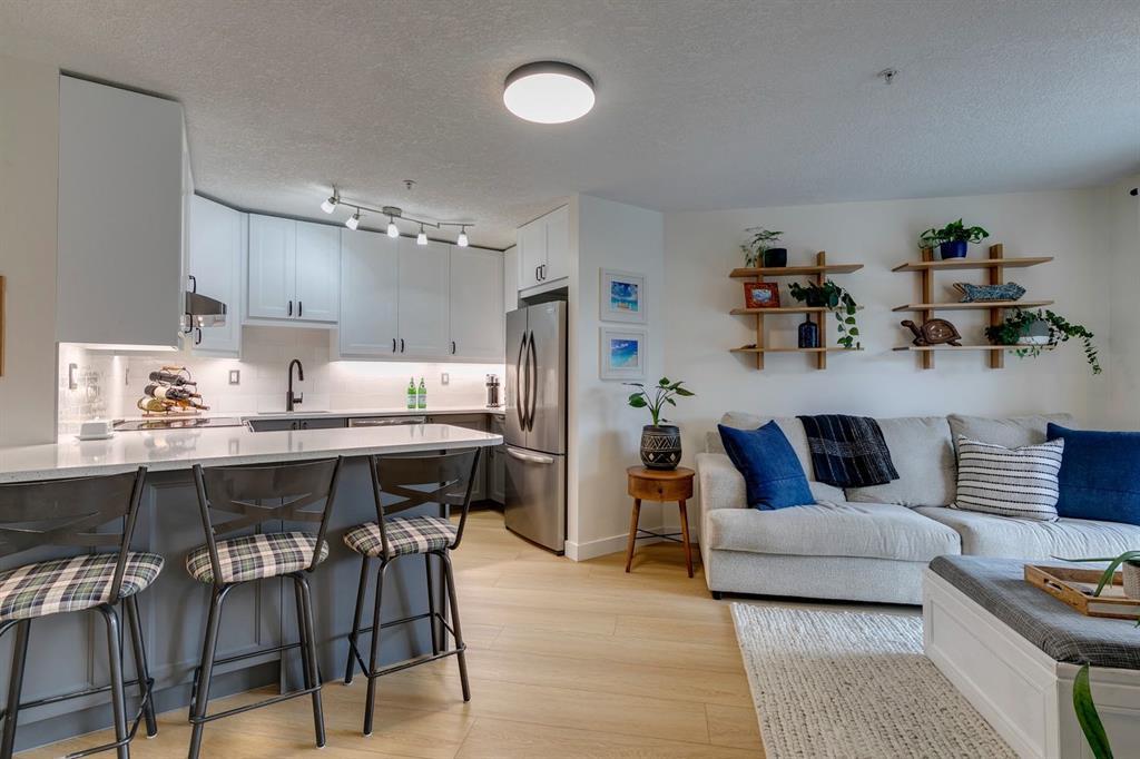 Step into your quiet piece of paradise, in the heart of the action in desirable Marda Loop! Fully and stylishly RENOVATED 1 bedroom, 1 bathroom plus den at a fantastic price! The redesigned kitchen marries style, quality, and functionality with all new two-toned cabinetry, soft-close drawers, a complete suite of new, stainless steel Frigidaire appliances, a breakfast bar with under-island storage, new quartz counter tops under-cabinet lighting and more. The living area is the perfect place to relax at the end of the day or entertain a few friends with sliding doors onto the OVERSIZED SOUTH BALCONY! Come feel the serenity of the spacious bedroom, complete with cordless cellular blackout blinds and custom drapes. Walk through your closet to a spa-like bathroom, fully gutted with new WALK-IN shower, stylish hexagon tiles, wood vanity and great lighting. Indoor, titled parking space and tons of storage in-unit with stacked washer/dryer. The front den is perfect for a work-from-home setup or could be converted to a little yoga spot, a mud room or close it in as a full storage room. New wide-plank flooring and tasteful light fixtures throughout. This unit backs onto a quiet laneway of iconic Garrison rowhomes, while still being just one block from Safeway, Village Ice Cream, Cobs Bread and two blocks from Deville and Phil&Seb Coffee! River Park is nearby for strolls with your favourite pooch and the access onto Crowchild make getting around the city a breeze. Pet-friendly, secure building with strong pride of ownership. Make your home ownership dreams a reality today!