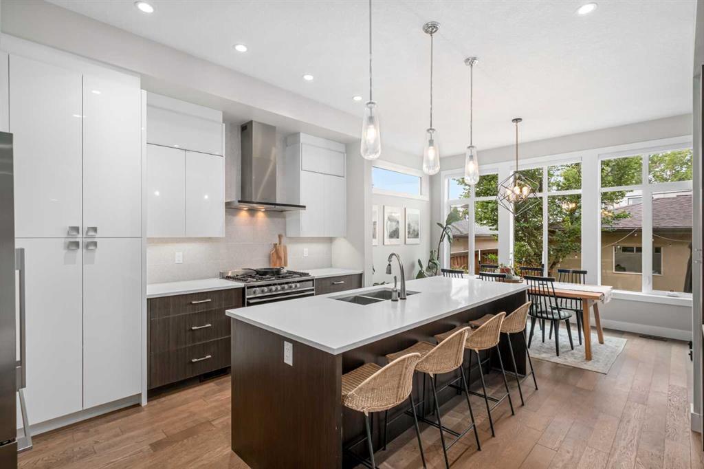 Welcome to this stunning and meticulously designed home, offering almost 2,400 sq ft of developed living space and showcasing a blend of luxury, comfort, and thoughtful details. Step into the heart of the home—a bright, sun-filled kitchen and dining area that boasts large windows, inviting an abundance of natural light. The gourmet kitchen is a chef’s dream, featuring a premium 36" range and high-end Fisher & Paykel appliances, perfect for both casual cooking and culinary masterpieces. Rich hardwood floors run throughout the main living areas, adding warmth and a sense of timeless elegance. The home features 10ft ceilings throughout, even in the fully finished basement, enhancing the spacious feel of every room. The basement is not only expansive but also features in-floor heating, providing a cozy retreat during Calgary’s colder months. The luxurious ensuite bathroom also benefits from in-floor heating, creating a spa-like experience every day. For added convenience, the home includes a heated double detached garage with plenty of storage space, making organization and access to your belongings a breeze, especially during the winter. Outdoors, enjoy the south facing exposed aggregate patio, an inviting space perfect for entertaining, barbecuing, or simply relaxing in your private backyard. Whether you're hosting guests or enjoying a peaceful morning coffee, this patio area is a delightful extension of your living space. This property is ideally located just a 2-minute walk from a nearby park and green space, offering tranquil surroundings and a perfect spot for outdoor activities. Dog owners will appreciate the proximity to an off-leash dog park, making this home equally appealing to pet lovers. For those who enjoy urban conveniences, you’ll love the easy walking distance to both 17th Avenue and Marda Loop, two vibrant Calgary hotspots known for their excellent dining, shopping, and entertainment options. Whether you're enjoying the bright, open living areas or retreating to the cozy warmth of the heated basement, every inch of this home has been designed to enhance your lifestyle. With a blend of modern conveniences, high-end finishes, and a prime location, this property is truly exceptional