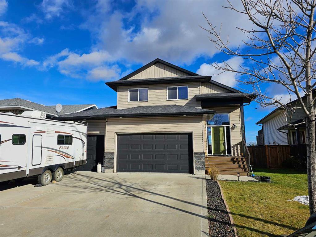This beautiful 2-story home in Wembley boasts no rear neighbors as it backs onto a large pond, giving you gorgeous views of nature all year round. Great for walks along the trail, bird and swan watching in the summer, and skating in the winter. You will enjoy many tranquil moments and stunning displays of sunrises and skylines. This home also has a massive 3 car garage and ample parking, even for your RV. Inside you are welcomed with lovely windows to enjoy the views and open to below ceiling feature that feels grand and unique. The main floor is open concept and spacious. Living room features a cozy gas fireplace and the kitchen is stunning with nice dark cabinetry, a large pantry, as well as great countertop space with eating bar options. Appliances are stainless steel and the dishwasher is only a year old. There is access to the deck from the dining room. A half bath and garage entrance complete this level. Upstairs you will find the spacious master bedroom with his and hers closets and a fabulous ensuite boasting double sinks and a steam shower. There is also a full bath and two good sized bedrooms, as well as a handy laundry room. The basement has some development done with all the walls up and painted, featuring a large family room, a bedroom and storage options. The nice large garage has great storage shelving, work bench, and access to the back yard as well. The yard is fully landscaped and fenced. This home has a lot to offer, make it yours today!