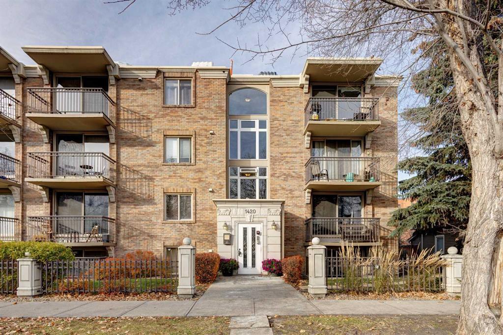 LOCATION, LOCATION - 3rd Floor City Skyline Views, River Pathways, South/West facing and tucked into a cul-de-sac off the main road - this quiet location is steps from Kensington and walking distance to downtown, the LRT and SAIT. Freshly painted and well cared for, this condo shows pride of ownership throughout. Floor plan opens to spacious foyer with storage, Open plan custom kitchen with granite counters, stainless steel appliances and kitchen island for entertaining. Dining area and living room are open plan and access the SOUTH facing balcony with views across the River and City Skylines. Primary bedroom is generous in size and boasts a double closet. The unit features a full 4 piece bathroom and an in suite washer/dryer. One assigned parking stall is also included with the unit. This concrete building is ideal for first time home buyers, down sizers or anyone wanting a great addition to their revenue portfolio.