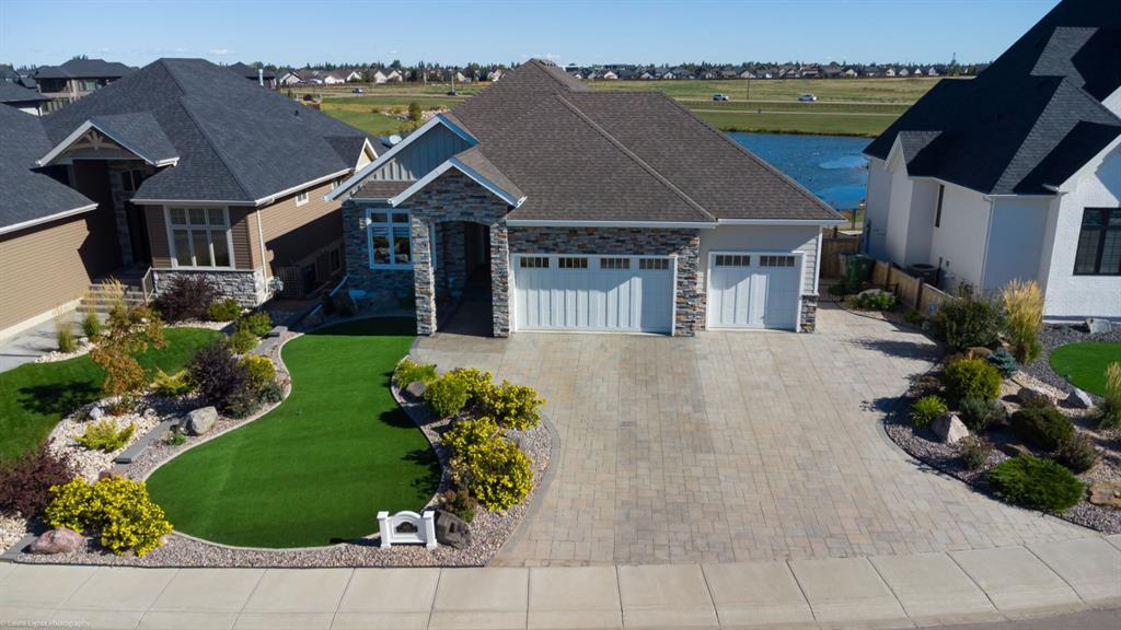 Have you been waiting for a stunning gem in the heart of the coveted New Lakeside development? From the moment you arrive, the curb appeal of this home is nothing short of breathtaking, with professionally landscaped grounds designed for low maintenance living. As you step inside, every inch of this property showcases thoughtful customization and attention to detail. Overlooking a man-made lake, this meticulously crafted residence boasts just under 1700 square feet of unparalleled elegance. No detail has been left out! Beginning with the triple garage featuring in-floor heating, offering both convenience and comfort. A walk-through mudroom/pantry seamlessly connects to the gourmet kitchen, adorned with custom cabinetry and top-of-the-line appliances. Quartz countertops add a touch of opulence, while huge windows frame captivating views of the lake, filling the space with natural light. With 10 foot ceilings, the main living area is warm and sophisticated with a travertine stonework fireplace serving as the focal point - perfectly complementing the open concept layout. Step through the door to the upper deck, where you can unwind and entertain in style against the backdrop of the lake! The main floor also features a versatile second bedroom, ideal for a flex space or home office. Convenience is key with main floor laundry and central vac, while central A/C ensures year-round comfort. The spacious primary bedroom offers a sweeping lake view, a spa-like ensuite, and a walk-in closet. The custom staircase leads to the lower level (also with in-floor heat) where a family room with wet-bar awaits. Enjoy the walk-out to the fully landscaped backyard (with an underground watering system) and lower patio, seamlessly blending indoor and outdoor living. Two additional bedrooms and a four-piece bathroom provide ample space for guests or family members, with loads of storage for your organizational needs. Experience the epitome of luxury living in this meticulously designed residence and take this opportunity to make this dream home yours!