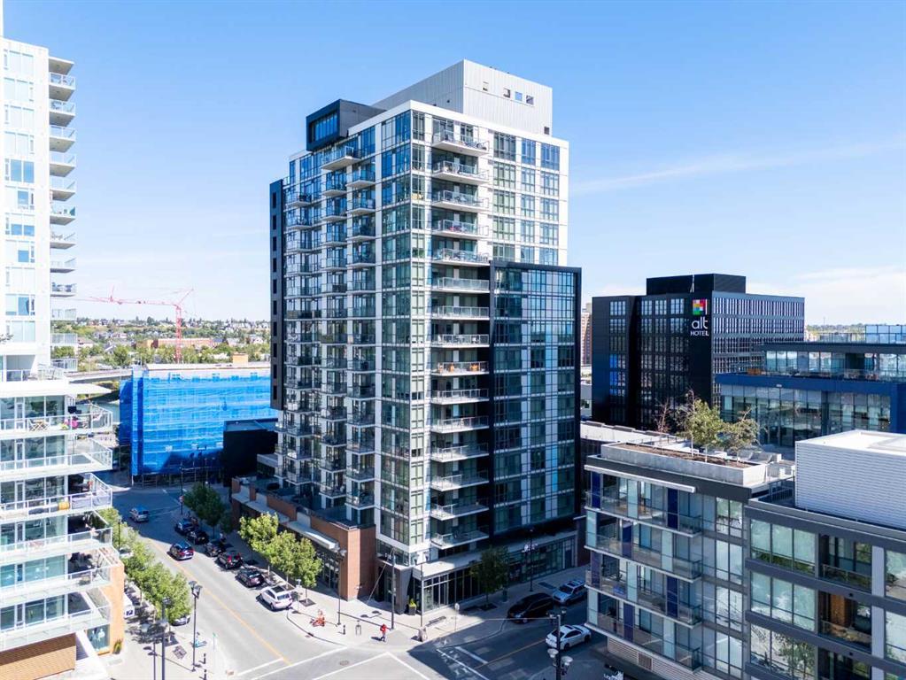Here's your opportunity to snap up this amazing maintenance-free living one bedroom plus den unit in the heart of East Village. The den is located just off the entrance has a large window, a bright & quiet workspace for a home office or it can be comfortably used as a second bedroom. Outdoor enthusiasts will love the river walk right out your door. Watch the city wake up while enjoying your morning coffee on the balcony. Culinary adventures await in the modern kitchen with island, stylish 3 tone cabinetry, quartz countertops with beautiful tile backsplash, and stainless-steel appliances. The island is great for prep space, entertaining friends, or can double as a dining table. Open the elegant barndoor to make your way into the master bedroom where you are greeted with a wall of windows and a walk-through closet into the attached 4 pc. bathroom. For your comfort and convenience, the unit comes complete with in-suite laundry, an underground parking stall, and a storage locker. The building amenities are amazing: breathtaking panoramic river, mountains, and city views will be the envy of your guests as you barbeque on the tranquil rooftop patio, you can stay in top shape with the well-equipped fitness room/ gym and yoga studio, organize a meeting in the boardroom, a game on the pool table, or have a celebration in the party area. The building has an onsite concierge to help make any arrangements. Plenty of shopping and eateries nearby. C-Train station is mere steps away. Walk to downtown core, along the river pathways, or to the revitalized St Patrick's Island! Visit the Bell Studio, shop at the new East Village shopping center with Winners and Superstore as major tenants, and easily access year-round events at the Stampede grounds. The unit is in fantastic condition as if it's brand new. Hurry and book your showing today before it's gone.