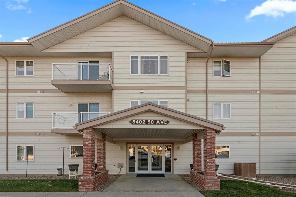 Welcome to Spruce Terrace Condominiums – where a simplified lifestyle awaits in the heart of Stettler. This top floor unit is available for immediate possession and features an easy open concept layout, perfect for everyday living or entertaining family and friends. This two bedroom, two bath unit has been updated with luxury vinyl plank flooring, providing a fresh and modern look. Classic oak kitchen with raised breakfast bar, corner pantry and bright windows with views to the street. Living room features cozy gas fireplace you will surely enjoy over the winter months. Spacious Primary Bedroom with 4pc ensuite bath and spacious walk-in-closet. You will appreciate the convivence of in-suite laundry, AC, as well as the heated parking stall assigned to the unit, that also has a storage locker for seasonal items. Residences take advantage of a variety of amenities, including a fitness room, a welcoming common area complete with fireplace, billiards, shuffle board and seating – perfect for social events with fellow neighbours, family and guests. Additionally, a guest suite is available when company comes to town, providing easy accommodation when needed. This building is secured with safety measures in place, ensuing peace and mind for owners. Just blocks from downtown, the condo offers care free living and accessibility.