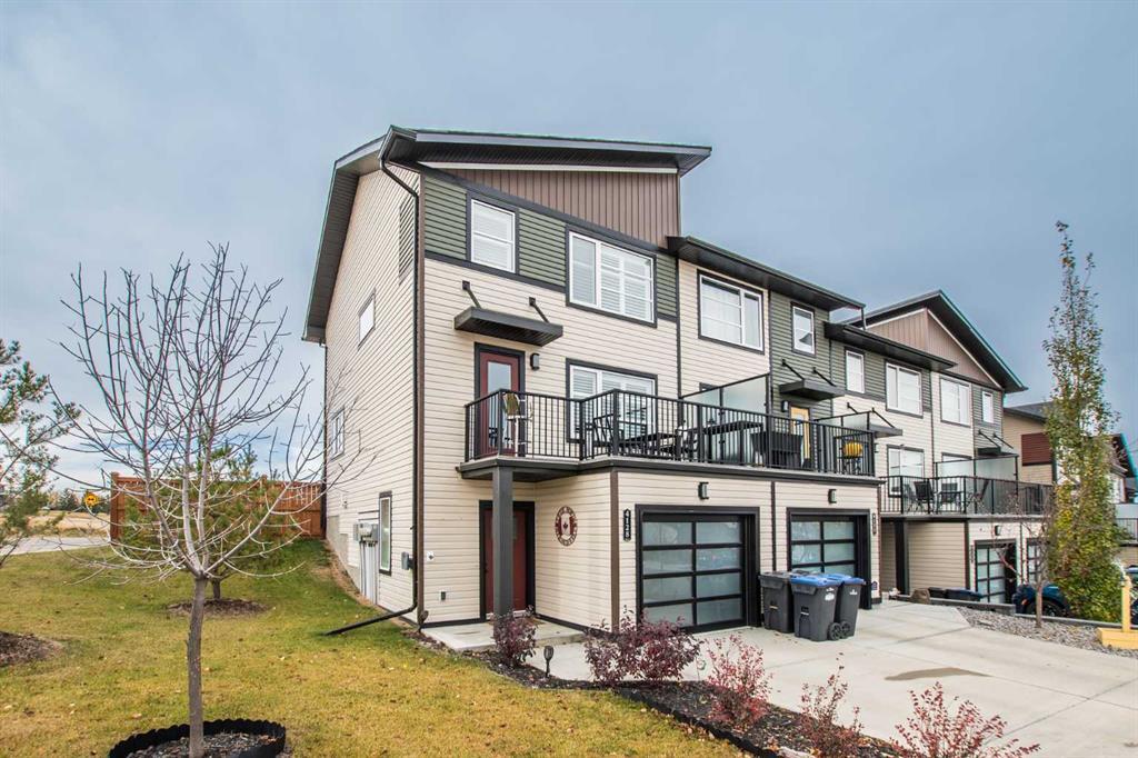 A end unit townhouse with a front attached single car garage in Ryder's Ridge. The curb appeal is accented by the modern style garage door and upper level deck. The entryway greets you with a decorative wallpaper feature wall that overlooks the black metal stair railings. The family room is complete with an electric fireplace, a wood feature wall & floating tv cabinets. There is a 4 piece bathroom on this level. Follow the laminate stairs up to the second floor that features an open style floor plan. Ceiling height maple kitchen cabinets are complemented by full tile backsplash, a large island with an eating bar, quartz countertops & stainless steel appliances. The eating area has patio doors out to the back deck that overlooks the backyard. The living room has a decorative wood feature wall & a patio door to the upper level front duradeck that has a view of the lake in the distance. There is a powder room with a barn door to the stackable washer and dryer. Upstairs features 3 bedrooms (with laminate flooring) and 2 bathrooms. The king sized primary bedroom has a 3 piece ensuite with quartz countertops, a window and a custom glass/tile shower. You'll appreciate the modern finishings throughout including upgraded baseboards/casings, black interior doors, window shutters and more! The backyard is landscaped and fenced. There is a 3 car gravel parking pad in the back.