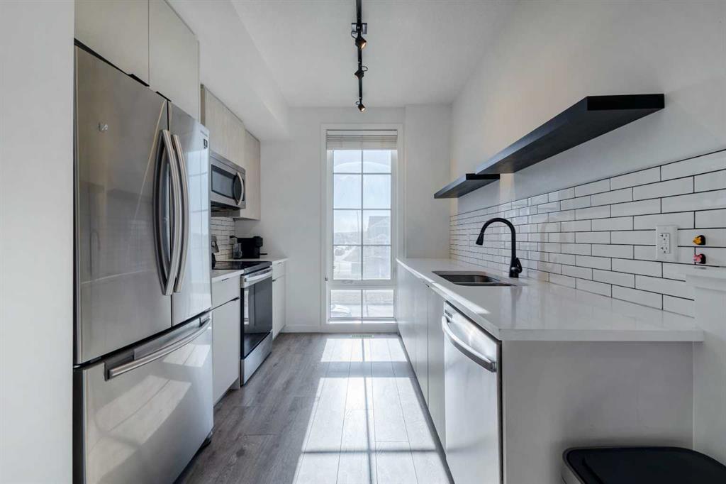Welcome to Holland Park! Discover this meticulously maintained townhouse in the desirable community of Walden. Perfectly suited for first-time homebuyers and savvy investors alike, this 2-storey townhouse features 2 spacious bedrooms and 2 baths with an open-concept floor plan that maximizes space and light. Step inside to find luxury vinyl plank flooring throughout the main level, seamlessly connecting the living room, dining area, and kitchen. The modern kitchen boasts sleek stainless steel appliances, stylish white and wood-pattern cabinets, and elegant white quartz countertops, complemented by chic black handles and faucets. Upstairs, you’ll find two generously sized bedrooms, a convenient laundry room, and two full bathrooms, offering both comfort and functionality. The lower level provides a welcoming foyer, a storage room, and an oversized single attached garage for all your needs. Plus, the full-size partially covered parking pad adds extra convenience. After a long winter in Calgary, you will be pleased with spacious balcony, perfect for entertaining or relaxing. This property is in pristine condition and ready for you to call it home! Don’t miss out on this incredible opportunity—call today to schedule your private showing!