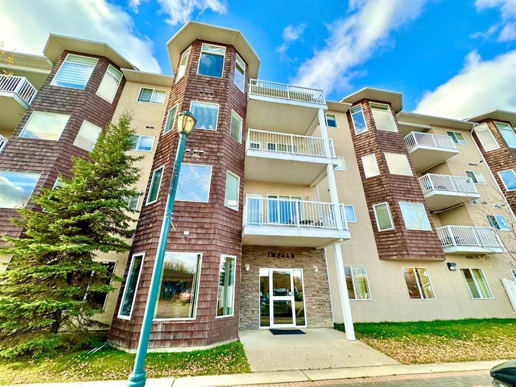 REDUCED! Check out this affordable corner unit on the second floor of the Impala! This corner suite has windows on 2 sides and faces South West where you can enjoy sitting on the sunny balcony. The Impala is a wonderful place to reside if you want to live walking distance to shopping, amenities, and the lake and live in a safe and secure building! The elevator is handy off of the main foyer making it easy for people to move from floor to floor and haul in supplies. The kitchen has a corner pantry, 3 appliances, and counter with a sandwich bar area. From the dining area you can walk out the patio doors, and enjoy the wrap and deck with gas hook up for a bbq. The Livingroom is open to the dining and kitchen and features gorgeous hard wood! This unit has a side by side washer and dryer in the handy laundry room. You will also find a brand new upgraded hot water on demand system! Enjoy toasty feet with the in-floor heating The bedrooms have carpet. The master bedroom has a spacious walk through closet to the 3 piece ensuite bathroom. The main bathroom includes a tub with a shower. The building is very well kept. You will be supplied with a hand held remote for the gated parking area where you will have a powered covered parking stall to keep the elements off your vehicle.. Each unit also has an assigned storage unit on the main floor. Book the social room with a kitchen, tables, and pool table for gatherings. The is also exercise equipment that can be signed out by residents. The library is also a shared area that you can enjoy on the main floor. Condo living makes it easy to lock up and go with no worries about lawns and shoveling snow! This home is priced to sell with and recent $8000 upgrade! Call to book your viewing today!