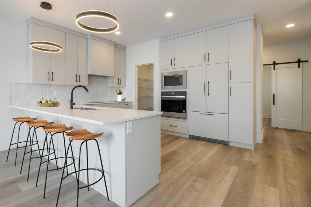 Welcome to the "Kinley" model by Stranville Living Master Builder, located in the highly desirable south Lethbridge community of Southbrook. This home backs directly onto the new Dr. Robert Plaxton K-5 public elementary school, whose property includes a new playground, soccer pitch, baseball diamond, and even a basketball court for today's active family. Southbrook is merely minutes away from big box shopping, various restaurants, and the VisitLethbridge.com arena and event center. Heading to the USA? The 24-hour border crossing at Coutts, AB is a short 57 minute drive on HWY #4. At 2,174 square feet of developed area, this home has a terrific amount of space for any size family and has an undeveloped basement that adds bedrooms #4 and #5 with a second family/living room, and a 3-piece bathroom upon completion. The main floor includes a beautifully appointed kitchen with Adora Cabinets extended to the ceiling, fully tiled backsplash, and quartz countertops. Stranville Living's top tier appliance package includes a seamlessly integrated paneled Fisher & Paykel fridge, paneled dishwasher, induction cooktop, built-in hood fan, and a stainless steel wall oven and microwave combo unit. A 10' extended eating bar on the kitchen peninsula can seat 4-5 people and is lit up by a couple very cool circular LED light pendants. The main floor also includes a flex room that can be used as a home office, yoga studio, or reading nook. A triple wide sliding patio door and large windows light up the dining room and living room, which also includes a sleek electric fireplace, built into floor to ceiling tile. Other main floor features include lockers at the mudroom, a built-in desk, and a 2-piece powder room. The second level includes three bedrooms, media room, and a large laundry room. The primary bedroom has a corner ensuite bathroom with freestanding soaker tub, dual vanities, and a tiled shower. The primary bedroom walk-in closet itself is nearly 100 square feet! This property is also fully fenced and includes a 12'x 12' rear deck with stairs to grade and a natural gas line for a BBQ. High efficient mechanical equipment, Low E windows, and spray foam in the rim joists help keep your heating and cooling costs in check. Must be seen to be appreciated! Photos contain virtual staging.