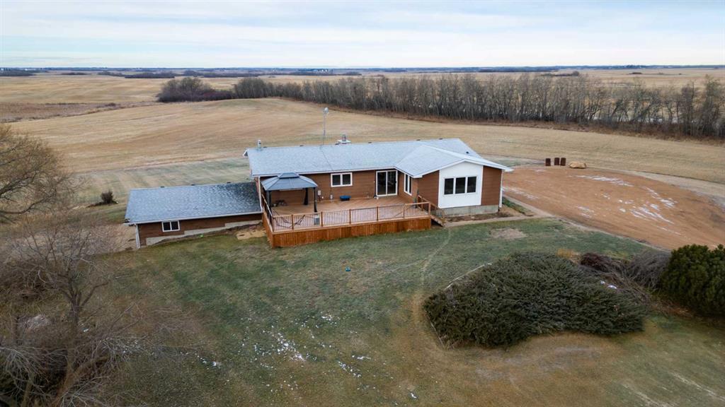 Looking for the perfect family retreat just outside of town? This stunning 8.5-acre property offers all the space and privacy you've been dreaming of, with the added convenience of being only 20 minutes from Camrose and just off the pavement. The 1,870 sq ft home boasts a spacious, functional layout featuring 2 bedrooms (with an office that could easily be converted into a third bedroom) and 2 well-appointed bathrooms. Enjoy the warmth and charm of hardwood floors throughout the entire main level. The newly updated kitchen is a chef's dream, and the bathrooms have all been beautifully renovated, including a luxurious walk-in shower in the ensuite. The basement is unfinished basement allows you to create your own ideal floorplan. Outside, you'll appreciate the brand new 20' x 30' pressure-treated deck—ideal for enjoying those quiet country evenings. For the hobbyist or business owner, the property includes a massive 50' x 96' shop with 14' overhead doors at each end, along with additional outbuildings for all your storage and project needs. This property is move-in ready with updates throughout, including a 2-year-old furnace, 3-year-old hot water tank, and brand new eaves, soffits, facia, and downspouts. The attached, heated 2-car garage adds even more convenience to this fantastic offering.