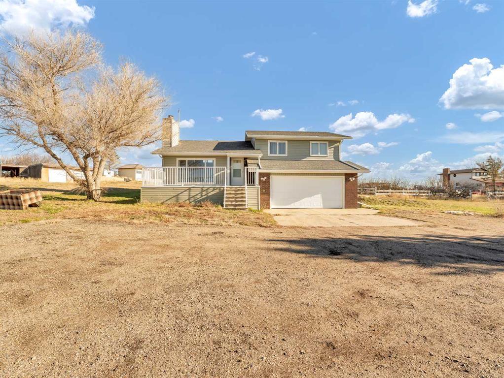 This charming 4-level split home sits on a generous 2.56-acre lot, located just ten minutes from Medicine Hat, offering the perfect blend of country living with convenient access to city amenities. As you enter, you are greeted by a spacious living room featuring a cozy wood-burning fireplace, providing a welcoming atmosphere for family gatherings or relaxing evenings. From here, you can head up to the next level, where you'll find a bright and inviting kitchen and dining area, ideal for meal preparation and entertaining. The dining space opens up to a deck that overlooks the expansive yard, making it a perfect spot to enjoy outdoor meals or simply take in the surrounding natural beauty.