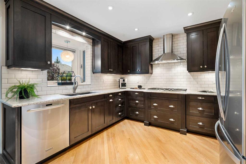 Tucked away in the highly sought-after NW Edgemont community, this beautifully maintained & updated walkout home, features 6 bedrooms, 4 bathrooms, and over 3,400 square feet of developed living space. Situated on a large, peaceful, tree-lined lot, this property offers a blend of elegance, space, and practicality for modern family life. Upon entering, an inviting open foyer guides you into the formal living and dining areas, perfect for both gatherings and intimate family dinners. At the core of this home is a fully renovated kitchen by Legacy Kitchens, where no expense was spared. This high-end renovation, featuring Cesar Stone counters, stainless steel appliances—including a gas cooktop and wall oven—creates a space that any culinary enthusiast will appreciate. Adjacent to the kitchen, the family room exudes warmth with a cozy gas fireplace, custom built-ins, and a convenient wet bar. A casual dining nook, overlooking the lush backyard through updated windows, provides an ideal setting for relaxation or entertaining. Completing the main floor is a versatile office with built-in cabinetry and a desk by California Closets (or an extra bedroom), a 2-piece powder room, and a well-designed mudroom. On the upper level, 4 additional spacious bedrooms await, including the extended primary suite, which offers a sitting area, an ample walk-in closet, and a luxuriously renovated 4-piece ensuite. This ensuite is a true retreat with its elegant fully tiled shower, dual sinks, Legacy cabinetry, and a useful sitting area. To add convenience, a dedicated laundry space is included within the main 4-piece bath, streamlining daily routines. The fully finished and freshly painted walk-out basement, complete with updated flooring and ceiling lighting, provides a large open recreation room that flows into the lovely backyard—ideal for summer barbecues and outdoor play. This level also includes another bedroom or office, a 2-piece bath, and plenty of storage space. This home has been thoughtfully maintained and upgraded over the years, including a renovated kitchen, family room, ensuite, main floor powder room; “Euroslate” rubber roofing (2014), the majority of windows replaced (Pella), furnaces (2011), hot water tanks (2023), air conditioning (2021), freshly painted exterior, upgraded insulation (2022) and a sump pump (2021). Every element has been designed to provide comfort, style, and lasting peace of mind. Situated on a charming and quiet street, this home benefits from proximity to schools, the scenic beauty of Nose Hill Park, extensive walking paths, ravines, and abundant amenities. Whether you’re enjoying a peaceful walk in the neighborhood or admiring the views from your backyard, this home offers an exceptional blend of tranquility and modern upgrades, making it the ideal family retreat in an established community! Welcome Home!
