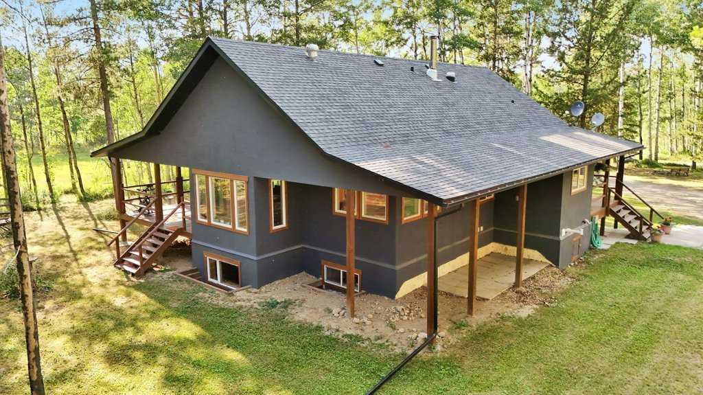 Discover a rare opportunity with this exceptional 149-acre property, ideal for generational family living or those seeking a versatile country retreat. This expansive estate features two distinct homes and offers breathtaking west country views including the mountains in the winter time when the leaves are off the trees! The main residence is a charming 1600 sq ft ranch-style bungalow with a fully developed ICF basement. The home welcomes you with an inviting back porch/main entry showcasing custom storage and a rustic feature wall. Inside, the open-concept living and dining rooms are highlighted by vaulted ceilings and abundant natural light from windows on all sides as well as from the skylights above. A cozy wood-burning stove with a striking stone backdrop adds warmth and character. The gourmet kitchen is a culinary delight, equipped with ample cabinetry, counter space, and a floating island. The main floor also includes a laundry room, an office (which can double as a bedroom), and a loft space perfect for yoga or meditation. The primary bedroom offers garden doors leading to the expansive covered deck, generous closet space, and a luxurious 5-piece bathroom with modern tiling, an air tub, and a multi-head rain shower. The developed basement provides an open recreational area, two additional bedrooms, and another 4-piece bathroom. Outside, the property features a single-car garage/workshop/boathouse, dog runs, fire pits, and numerous relaxing spots. Enjoy seasonal wild blueberries, strawberries, and raspberries! The second home, a 1200 sq ft bungalow located on the opposite corner of the property with access via Highway 54, requires renovation but presents a fantastic opportunity for customization and improvement. The property also includes a 50 x 100 shop with truck bay access, a 240 AMP blacksmith shop, and various sheds and outbuildings. This space is perfect for those looking to start a business or pursue a hobby, with excellent highway visibility. The land includes 86.22 acres of pasture with ongoing oil and hay crop revenue. Additionally, the main home site boasts 3 acres of saskatoons, including Smokey East Patch, Northey Middle Patch, and Smokey West Patch. This unique property offers a perfect blend of privacy, space, and potential, making it an ideal choice for multi-generational living or diverse personal and professional uses. An incredibly picturesque estate with endless possibilities!