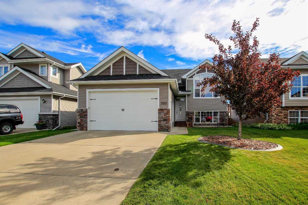 FULLY DEVELOPED 4 BED, 3 BATH BI-LEVEL ~ WALKOUT BASEMENT ~ HEATED 24' x 21' ATTACHED GARAGE ~ NO NEIGHBOURS BEHIND ~ NEW SHINGLES ~ Beautifully manicured front yard creates an inviting first impression ~ Step into a spacious foyer featuring tile flooring, a convenient coat closet, and high ceilings that open to the upper level ~ The main floor features an open concept design with vaulted ceilings and rich hardwood floors that create a feeling of spaciousness ~ The living room is filled with natural light from the large west-facing window and features a cozy gas fireplace with a lighted TV niche above ~ Perfect for entertaining, the spacious dining area easily accommodates large family gatherings and flows seamlessly into the kitchen ~ The kitchen offers warm, stained maple cabinetry, including a built-in desk and island with an eating bar, full tile backsplash, a large wall pantry, stainless steel appliances and a window above the sink that provides views of the deck and countryside beyond ~ Step through the garden door from the kitchen onto a spacious deck, offering a private retreat with no neighbours behind ~ The spacious primary bedroom easily accommodates a king sized bed and additional furniture, has a walk-in closet with custom built-in organizers, and is complete with stylish 3-piece ensuite featuring a walk-in shower ~ Two main floor bedrooms provide ample space and comfort, and share a well appointed 4 piece bathroom, perfect for family or guests ~ The fully finished basement features high ceilings, large above grade windows and efficient in-floor heating, creating a bright and inviting space ~ The expansive family room is bathed in natural light and offers French door access to a covered lower patio, seamlessly connecting to the backyard for indoor-outdoor living ~ A spacious basement bedroom can easily accommodate a king sized bed with room for a sitting area and features a generous west-facing window ~ The 4-piece basement bathroom includes an oversized vanity and a window that lets in fresh air and natural light ~ The basement also features convenient laundry facilities and ample storage space, adding to its functionality ~ Impressive HEATED double attached garage is fully insulated, featuring stylish epoxy floors, overhead shelving for extra storage and a convenient man door leading to the front yard ~ The beautifully landscaped backyard features decorative concrete edging, a convenient garden shed, is fully fenced and has back alley access ~ Nestled in a family friendly neighbourhood, just moments away from numerous parks, playgrounds, and scenic walking trails, plus enjoy the convenience of easy access to multiple schools, shopping plazas and vibrant downtown Lacombe with an array of local shops and dining options.