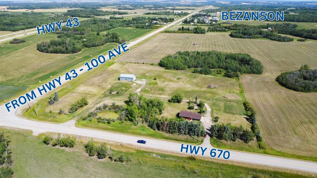 This 40'X60' concrete floor, radiant heated shop and residence is just over a km from the hamlet of Bezanson! Zoned Urban Reserve (presently 'Ag' Business only), a modest application fee can be made to the County of Grande Prairie for a zoning request change (i.e. to Commercial). Highway 670 skirts the west side of the 8.64 acre property with Bezanson's 100th Avenue across the north side. Gated approaches for the house and shop on west side. What a location for business, on the doorstep of Bezanson. 18km to Teepee Creek, 80km to Valleyview and just 30km from Grande Prairie! Three-level split home could use updates but is in fine condition and this listing is more about a business-opportunity-location that happens to have a residence. That said, it's a great yard with abundant lawn and greenery with a large garden area. Primary bedroom with two piece ensuite and the second bedroom is huge at 12'X29' because walls were removed to make it a large craft room. Easy to go back to three or four beds. Main level is large kitchen with dining area and living room. Third level is an open family room space with spot for wood stove. Work your business dream and live at Bezanson!