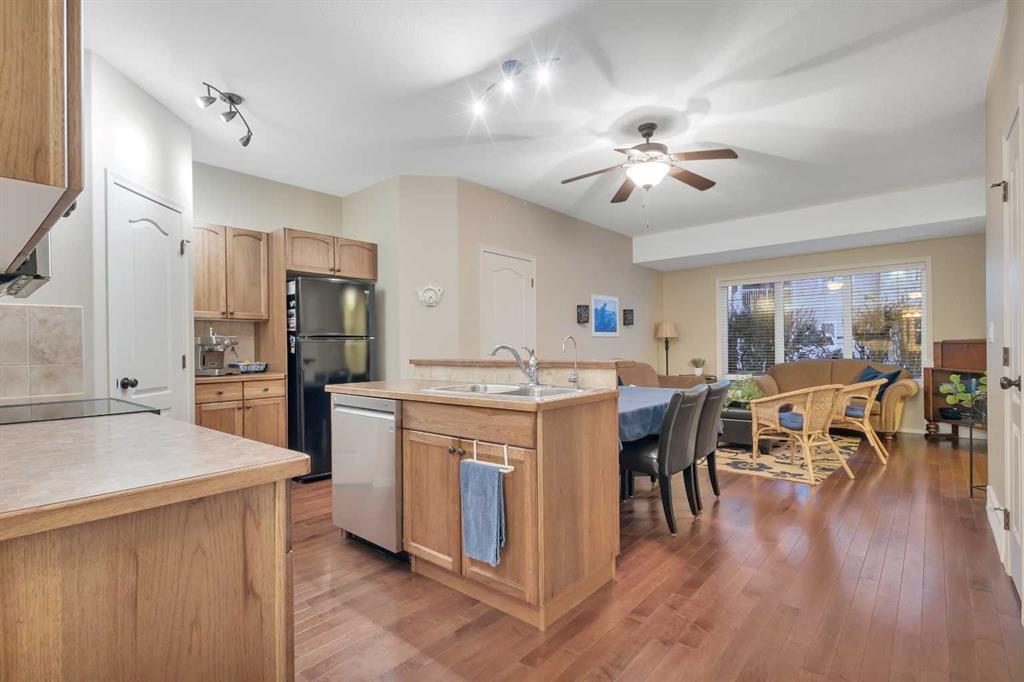 Visit REALTOR® website for additional information. That peaceful, easy feeling is here! Low maintenance, low condo fees, and a great location come with this ground-floor condo in Cottonwood Estates, Blackfalds, AB. Enjoy parks, a pond, green space, and walking trails nearby. The open-concept design features hardwood floors in the living room and kitchen. The primary bedroom includes two large closets, while the second bedroom is perfect for guests or a home office. Storage options include a pantry, linen closet, cleaning closet, and a storage room with a freezer outlet. Updates include a microwave (2020), hot water tank (2020), LG range (2020), dishwasher (2023), and washer/dryer (2023). With no stairs and powered parking steps from the door, this home is accessible and convenient. Surrounded by nature and close to amenities, this condo offers peaceful living with all the comforts you need.