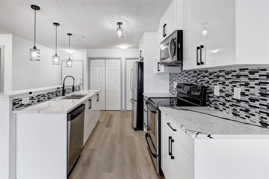 Renovation just completed! This 2 bedroom, 2 bathroom unit boasts brand-new features throughout! Including new cabinets and countertops, stylish luxury vinyl plank flooring in every room, fresh paint, new baseboards and casings, modern lighting and more… This unit is definitely a must see! It has an open floor plan and at the heart is the shinny new kitchen featuring a stylish Island with a raised breakfast bar-perfect for casual dinning or entertaining. Enjoy the convenience of a brand new stainless steel sink with a sleek new faucet. You’ll fall in love with the new white cabinets, stunning quartz countertops, new glass tile backsplash and new dishwasher! The east facing balcony off the living room is perfect for enjoying your morning coffee and watching the sunrise during warmer weather. The Master suite offers dual closets, a spacious walk in closet and a beautifully updated 4PC ensuite bathroom. The second bedroom located on the opposite end of the unit for added privacy is a great size and is conveniently situated next to the additional updated 4PC bathroom. A perfect setup for guests, family or a home office. In-suite Laundry can be found in the storage room, adding both practicality and extra space for your belongings. This move in ready home is close to dinning, shopping, golf course and steps to a lovely walking path, book your showing today!
