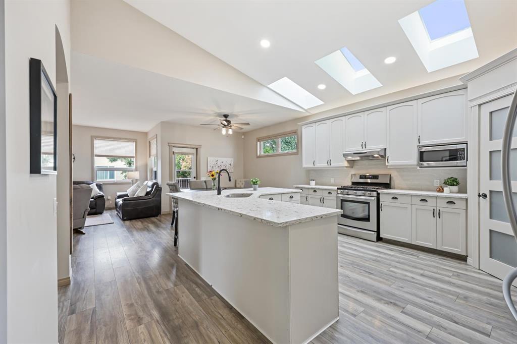 Nestled in the sought-after community of Airdrie, this south-facing bungalow is a sanctuary of light and space, offering 3,271 sqft of meticulously crafted living areas to meet your every need. From the moment you arrive, the extensively wide driveway and oversized heated garage, featuring in-floor heating and a skylight, signal the thoughtful design that defines this home. The grand entryway, with its open and airy ambiance, sets the tone for the sophisticated spaces that lie beyond. Upon entering, a private living room offers a quiet retreat, perfect for reading or relaxation. Moving ahead, a 12-foot vaulted ceiling in the open-concept kitchen creates an impressive sense of space, enhanced by Natural light pouring in from three skylights, sleek quartz countertops, LED recessed lighting, premium stainless steel appliances and a generous dining area, perfect for hosting family and friends. The adjoining 19-foot family room is a warm and welcoming gathering spot, complete with a gas fireplace, built-in cabinetry, and shelving that adds character and convenience. Retreat to the enormous primary bedroom, a private oasis with a walk-in closet and spa-like 3-piece ensuite. A second bedroom and a full guest bathroom provide additional comfort and practicality. The laundry room, featuring 11-foot ceilings and mezzanine storage, makes household tasks easier than ever. The fully finished basement offers unparalleled versatility. Warmed by in-floor heating, it boasts a massive entertainment area, two spacious bedrooms, and a third full bathroom, making it ideal for guests or multi-generational living. Step outside to your quiet, fenced backyard, where every detail encourages relaxation. From the brand-new Duradek designed for durability, to permanent outdoor lighting that creates an enchanting atmosphere, and a gas line for the BBQ - this space is perfect for hosting or unwinding. A storage shed completes the backyard, offering practical solutions for outdoor essentials. This is more than a home—it’s a lifestyle tailored to comfort and elegance. Designed with modern finishes, natural light-infused spaces, and an open-concept layout, this property offers the perfect balance of luxury and functionality for a growing family with its close proximity of schools and parks.