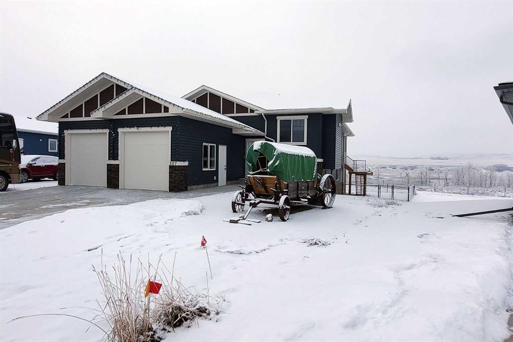 **OPEN HOUSE SATURDAY JAN.18 2-4pm** Welcome to 507 Malmberg Place in beautiful Longview Alberta, located about 30 minutes South of Okotoks. This home sits at the beginning of a quiet cul-de-sac with gorgeous views, ravine and no neighbors behind. As you walk in, you can head up to the spacious main level which consists of an open floorplan, kitchen with stone counters, stainless appliances and ceiling height cabinets. Sit at the breakfast bar, or have a sit down diner in the large dining room. The main rooms are open to each other, allowing great communication and flow for entertaining. The living room has a floor to ceiling stone gas fireplace and the wall of windows stretches all the way across the back. Step out to your spacious (partially covered, and includes sun screens) deck which can also be accessed from the primary suite. There are 2 bedrooms, primary with walk-in closet and large 5 piece ensuite, plus a second bedroom, laundry and 4 piece bath. Both the main and lower levels have 11' ceilings making the space feel even grander. The finished walkout basement has in-floor heat, high ceilings, a second kitchen, a massive Rec.Room and 2 more bedrooms! Plenty of storage, second laundry and another 4 piece bath completes this space. Enjoy access to the lower patio, and fenced yard! Double attached garage, RV hookups and parking, plus central air and solar panels!! Come check this one out today!