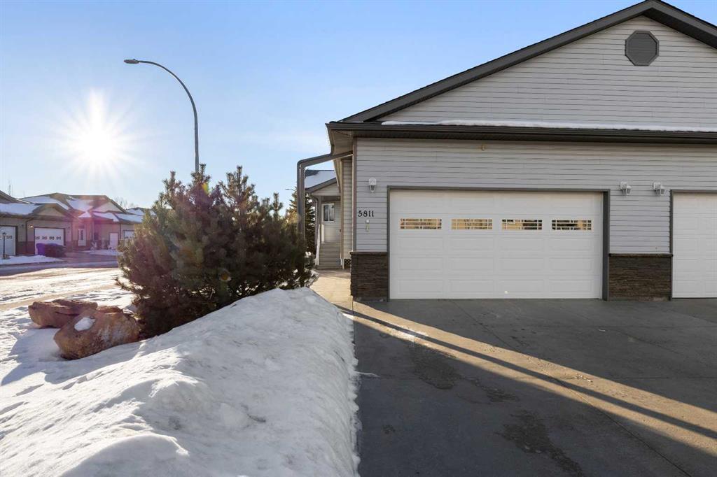 This great affordable home on a nicely landscaped corner lot is ready for you to call HOME ! The home features an open floor living plan , with garden door access to a large rear partially covered deck and south back yard from the living room, a good sized master bedroom with a walk-in closet and 3 piece ensuite with large walk in shower, an ample sized second bedroom, a 3 piece main bath, main floor laundry, and direct access to the double garage. In addition there are lots of cupboards and a pantry cupboard in the kitchen, a corner fireplace and hardwood flooring in the living / dining room, and the shingles were replaced in 2024. The basement with roughed in in-floor heating is partially developed with one bedroom and a 3 piece bath completed. The balance is ready for your creative touches. Ideal for a young family starting out, or anyone looking to downsize ! Come have a peek !