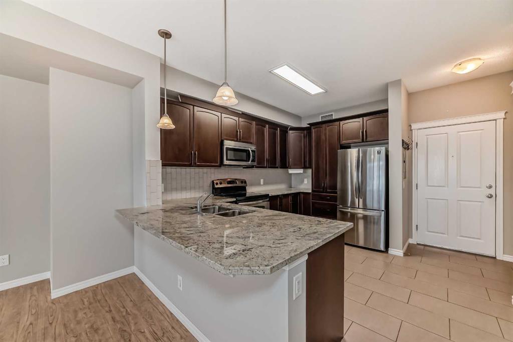 WELCOME TO THIS SUPER-PRICED DREAM CONDO, LOCATED IN A QUIET SE NEIGHBORHOOD OF AIRDRIE. THIS IS A BEAUTIFUL TOP FLOOR, 2 BDRM, 2 BATH, 9 FT CEILINGS, 2 PARKING, STORAGE and a nice balcony.overlooking greenery. You'll love this building from the minute you walk up to it and then walk inside. It's extremely well taken care of, and the hallways almost look new. The walls aren't scuffed up, the carpets are clean, the lights are modern and bright, and the hallways are wider than most. Entering in you will love the floorplan. There's a proper entrance with a closet and pristine flooring, and to the right is a really spacious kitchen with good quality cabinetry with mouldings at the ceiling, GRANITE COUNTERS, AND A BREAKFAST BAR THAT SEATS 4. SS appliances (including a newer Bosch dishwasher and Samsung fridge) To the side is a nice dining area that goes into the Livingroom. You'll notice the huge windows, and you won't need to turn on the lights if you don't wish to. Then go to your own private balcony, relax, entertain and enjoy the morning sun. The primary bdrm has two windows, and the ensuite is a 3-piece with a large walk-in shower. There's another 4-piece bath with a soaker tub and another good-sized 2nd bdrm. This condo complex is conveniently located within walking distance of Save on Foods, Shoppers Drug Mart and other amenities and services, and the location provides easy access to Highway 2. You are so close to the shopping center and the highway, but far enough that it's very quiet. Why rent, don't miss this one; it'll go quickly. Pets allowed, 2 cats or 2 dogs, max 30 lbs.