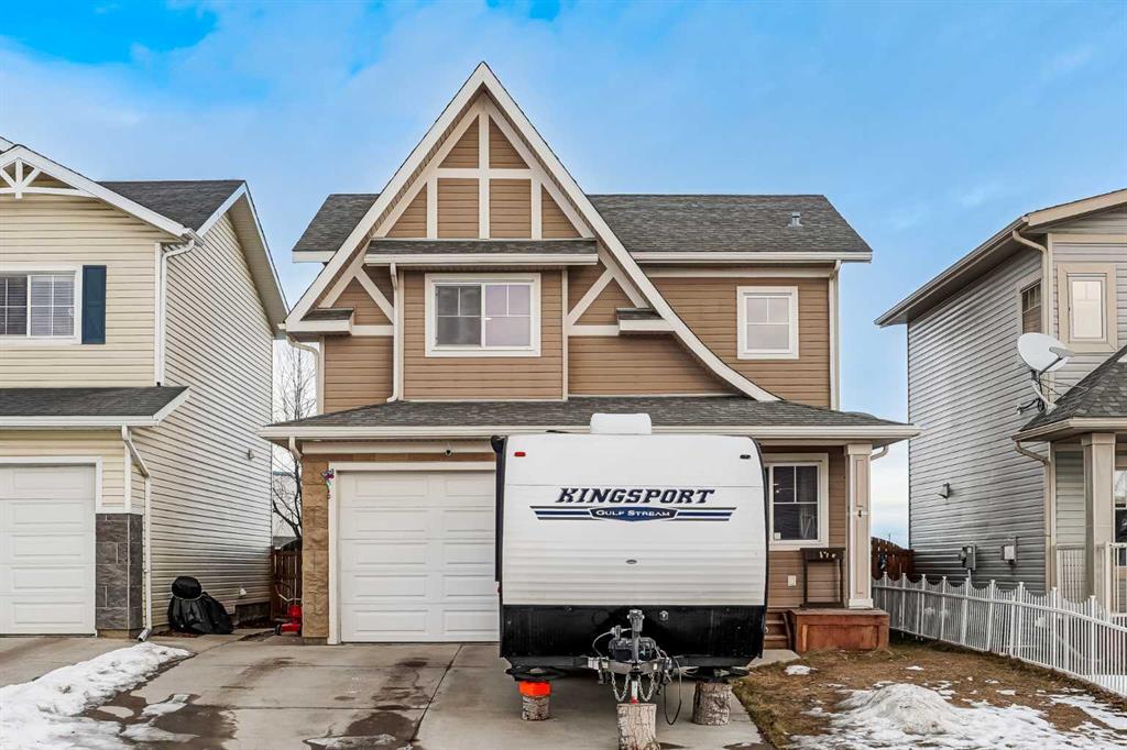 Welcome to 4 Mackenzie Way! Offering the perfect balance of small-town living with easy access to Airdrie and Calgary, this family-friendly home is a fantastic opportunity for first-time buyers, young families, or those looking to downsize. Situated just minutes from schools, shopping, dining, Tim Horton’s, the Carstairs Golf Club, and the Carstairs Memorial Arena, this property also offers a quick 30-minute commute to North Calgary. The main floor has an inviting living room with corner gas fireplace, perfect for relaxing on chilly evenings, and functional kitchen with a breakfast bar, and pantry. The kitchen opens to a cozy dining area with a door leading to the expansive backyard, complete with a large deck—ideal for outdoor entertaining. A convenient 2-piece bathroom and laundry room round out the main level. Upstairs, you'll find a spacious primary retreat with 3-piece ensuite and a walk-in closet. Two additional bright and airy bedrooms share a 4-piece bathroom. The finished basement provides a large family room along with ample storage. There is a rough-in for a bathroom here for suture development. Notable features include a single attached garage that can fit a truck, a fully fenced and private backyard backing onto green space. This home also offers plenty of parking with space for two additional vehicles on the extended driveway and RV Parking in the Back!