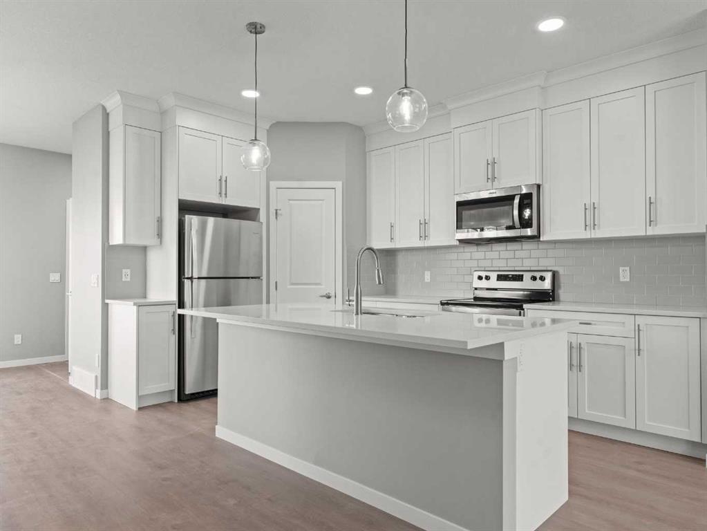 Located in the desirable Bayview community, this home is situated on an oversized corner lot only steps from parks, and the community path system. This mindful Calbridge designed home is the perfect opportunity for investors or a multi generational family with a FULLY SUITED BASEMENT, providing ample living space and privacy. With great curb appeal and a charming front porch, this home boasts upgrades like 9’ knockdown ceilings, designer lighting, and luxury vinyl plank flooring throughout the main floor. A central chef style kitchen is the focal point showcasing custom cabinets that reach to the ceiling, gorgeous quartz counters, timeless subway tile backsplash, SS appliances and a corner pantry for additional storage. Adjacent is the bright dining room with direct access to your full width deck! On the other side of the kitchen is a spacious living room making entertaining effortless. The main floor is complete with a mudroom and ½ bath tucked around the corner for privacy. Upstairs, relax in the spacious primary retreat with large windows, a walk-in closet, and a 4pc ensuite with a substantial vanity. You will also find two additional well sized bedrooms, a 4pc main bath with stone counters, and convenient upper-level laundry. The fully suited basement is filled with light from oversized windows and features an “L” shaped kitchen with modern finishes and SS appliances. This seamlessly connects to the living and dining room. A sizable bedroom, 4pc bath, and separate stacked laundry space complete this area. Plus appreciate the oversized detached garage and a separate paved parking pad for a 3rd vehicle. ENJOY PEACE OF MIND WITH NEW HOME WARRANTY. This is a must-see property, schedule your showing today or view the online virtual tour.