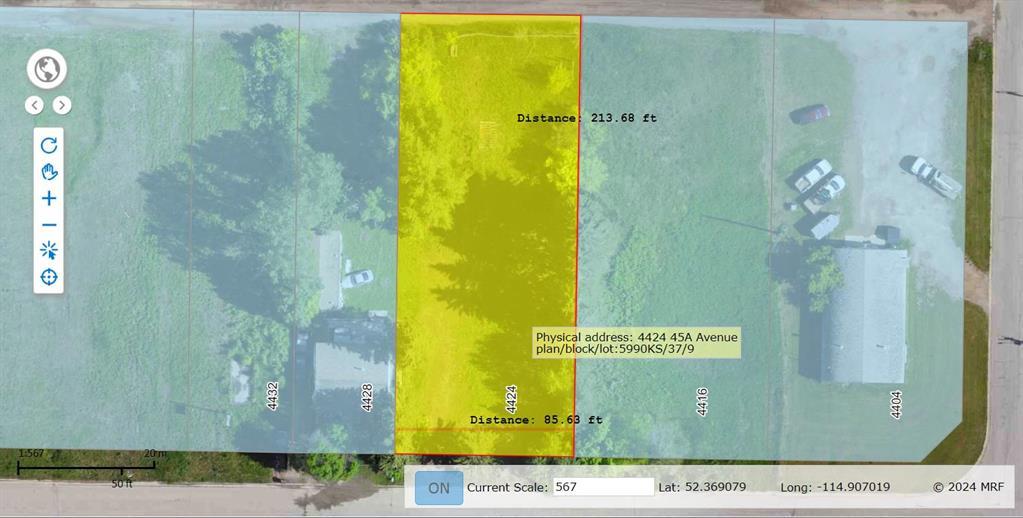 Prime general industrial land ready for your development in the heart of Rocky Mountain House (west central Alberta, located approximately 90 km's east of Red Deer / QE2). 0.43 acres, lot measurements are 87ft wide x 212ft deep. The parcel to the east this lot is for sale as well [4416 45A Ave MLS A2187689] both lots would give a development area of 0.88 acres 180ftx212ft. Located a block off the main highway running through the town of Rocky Mountain House, this location is easily accessible and visible from Hwy 11.