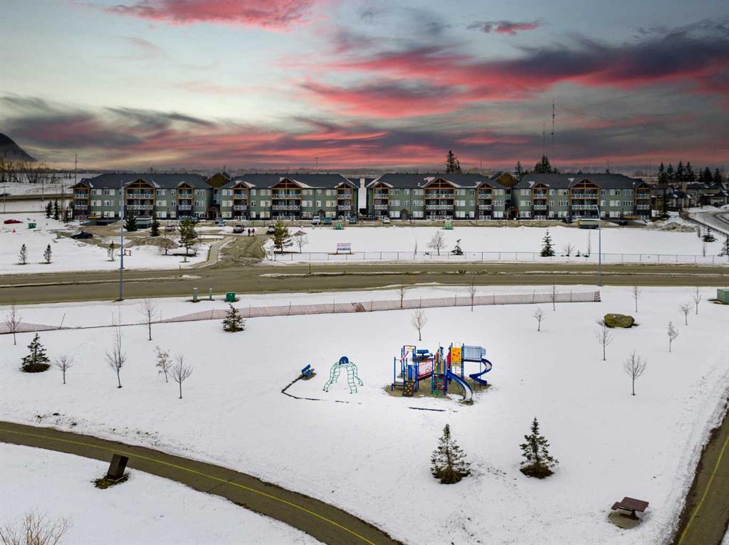 Picturesque living only a stones throw away from the city! Enjoy modern living and small town feel with this 2 bedroom 2 bathroom unit. This unit boasts beautiful contrasts with open concept living and sequestered quarters, 9 foot ceilings and cozy finishes, granite counters and soft tones, fireplace for winter and AC for summer (West facing Balcony). Enjoy easy access to shopping, schools, and beautiful pond walks (or fishing). In suite laundry, 1 underground title parking and 1 titled parking stall complete the package! Strathmore has everything you need, including a little distance from the big city. Quiet, comfortable and convenient, this unit might be the one for you!